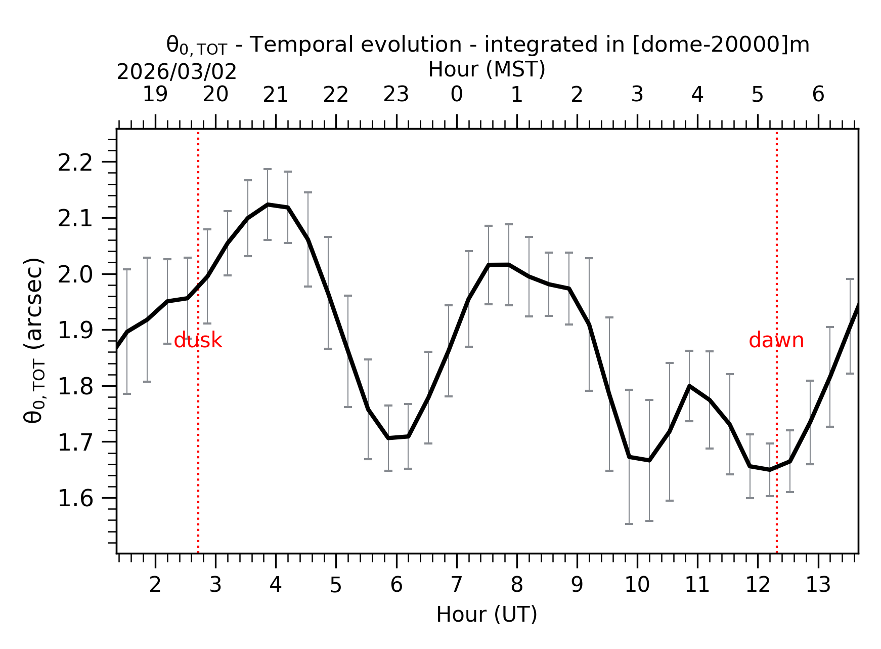 Fig. 2: Temporal evolution of θ0,TOT ([dome-20km]) between the sunset and the sunrise. |