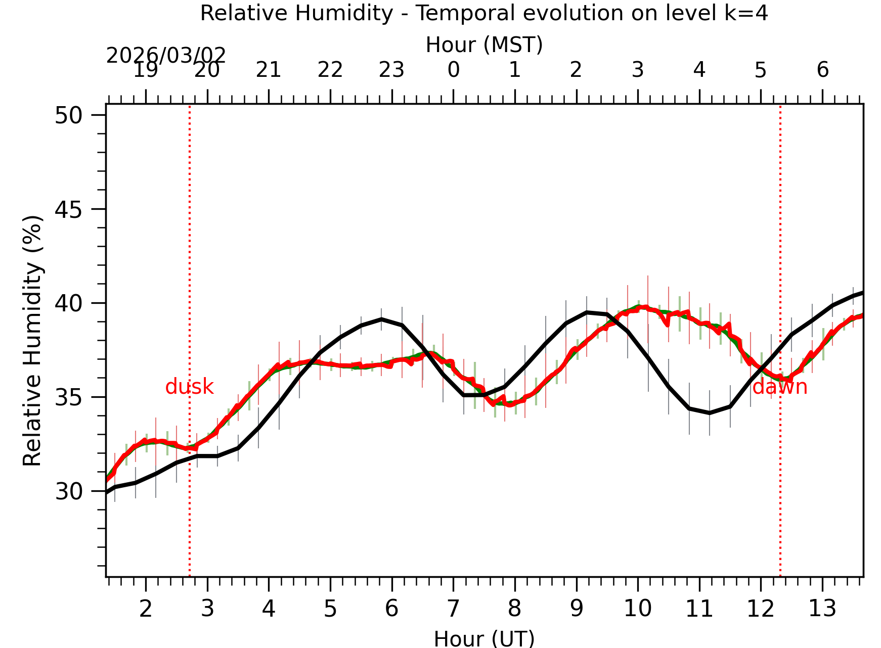 Fig. 8: Relative humidity temporal evolution between the sunset and the sunrise at [38-62]m. |