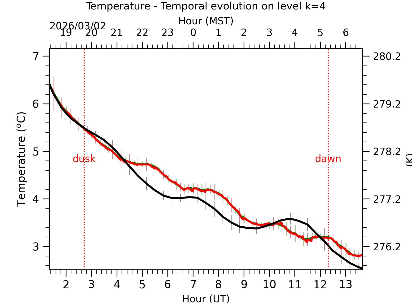Fig. 4: Absolute temperature temporal evolution between the sunset and the sunrise at [38-62]m. |