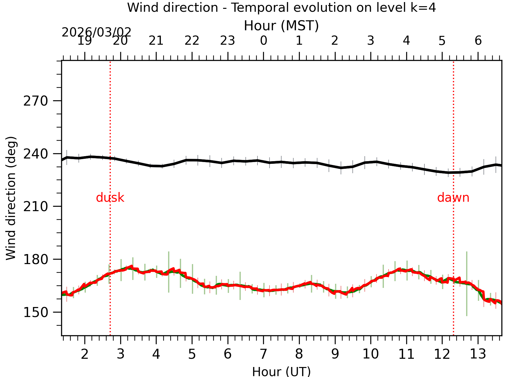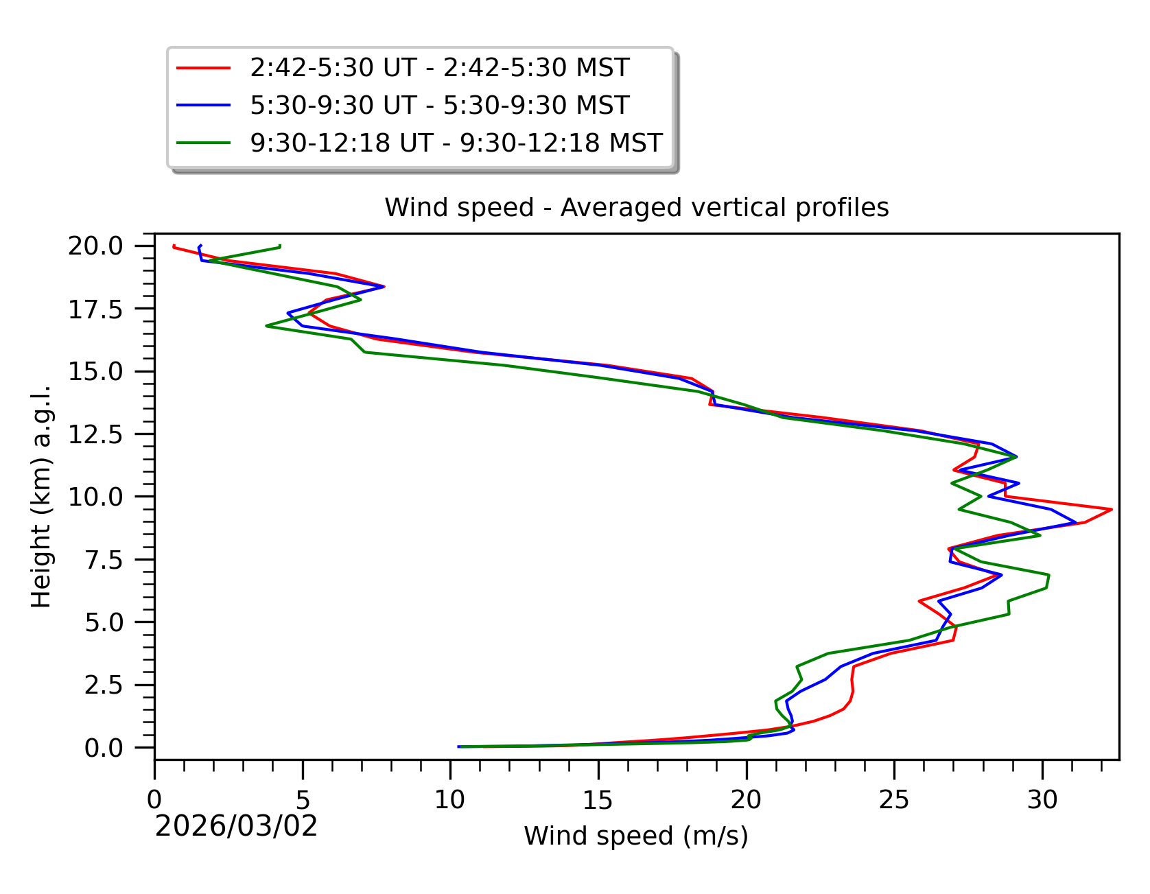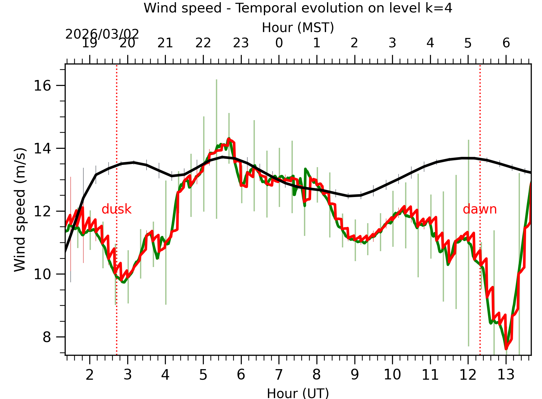 Fig. 8: Averaged wind speed in the three successive periods of the night (see red, blue and green intervals). |
