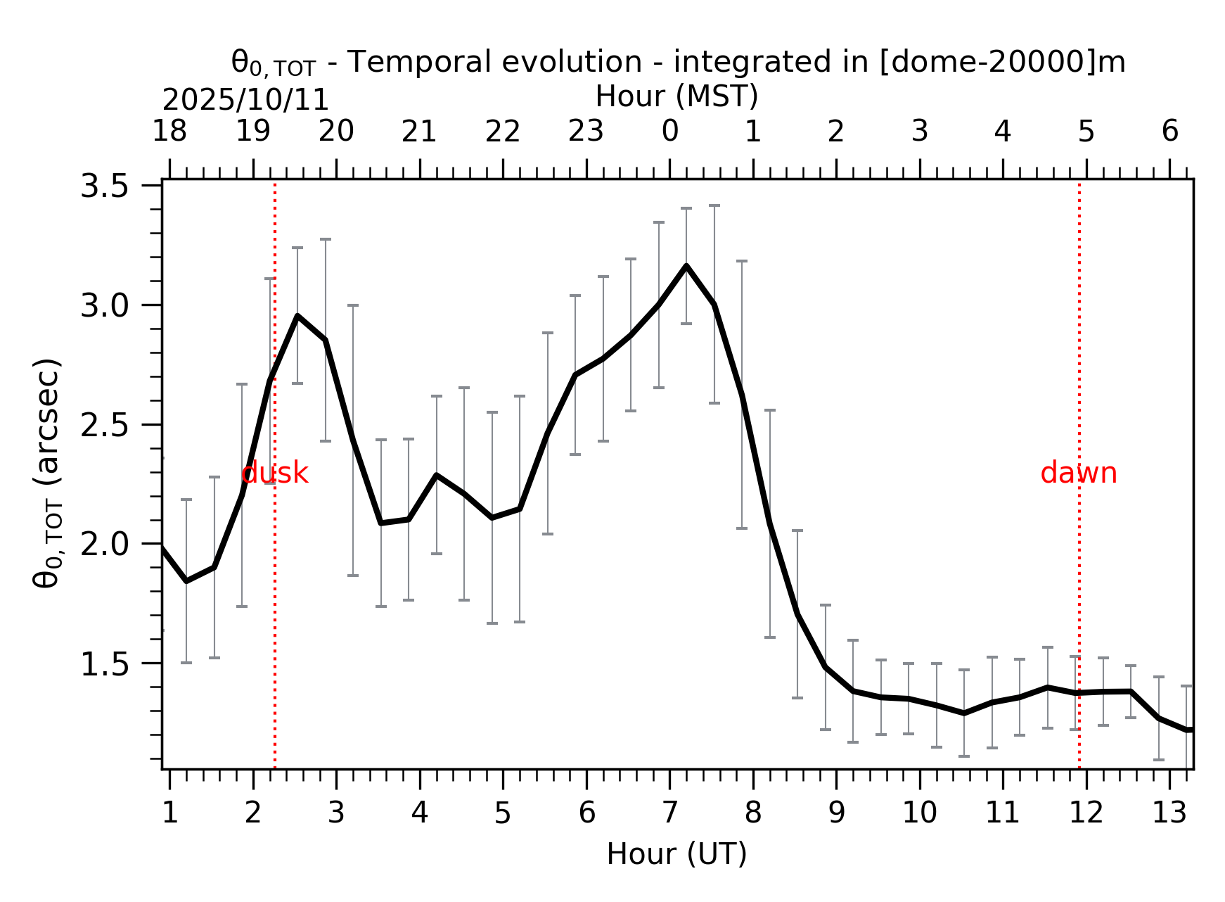 Fig. 2: Temporal evolution of θ0,TOT ([dome-20km]) between the sunset and the sunrise.