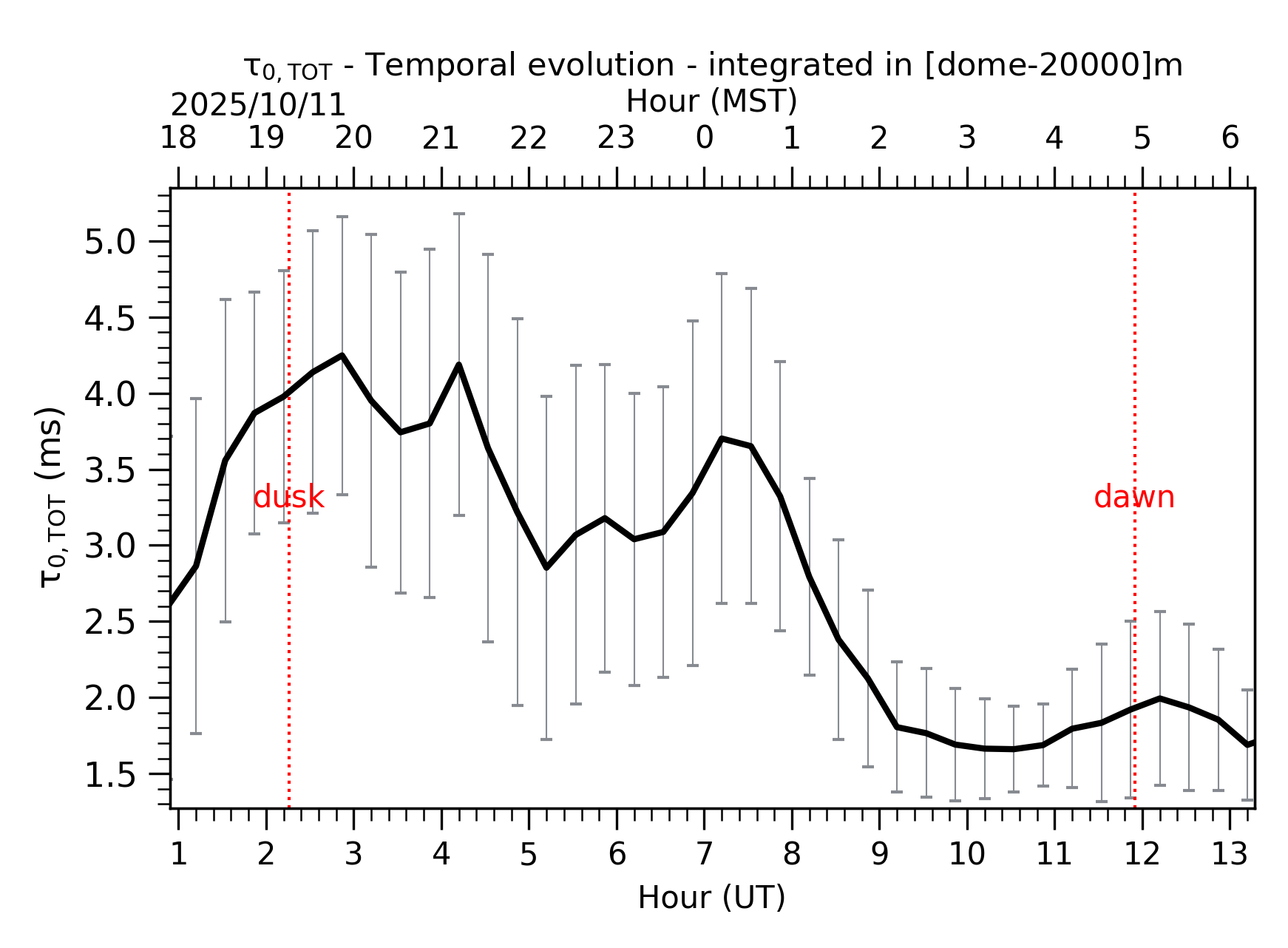 Fig. 3: Temporal evolution of τ0,TOT ([dome-20km]) between the sunset and the sunrise.