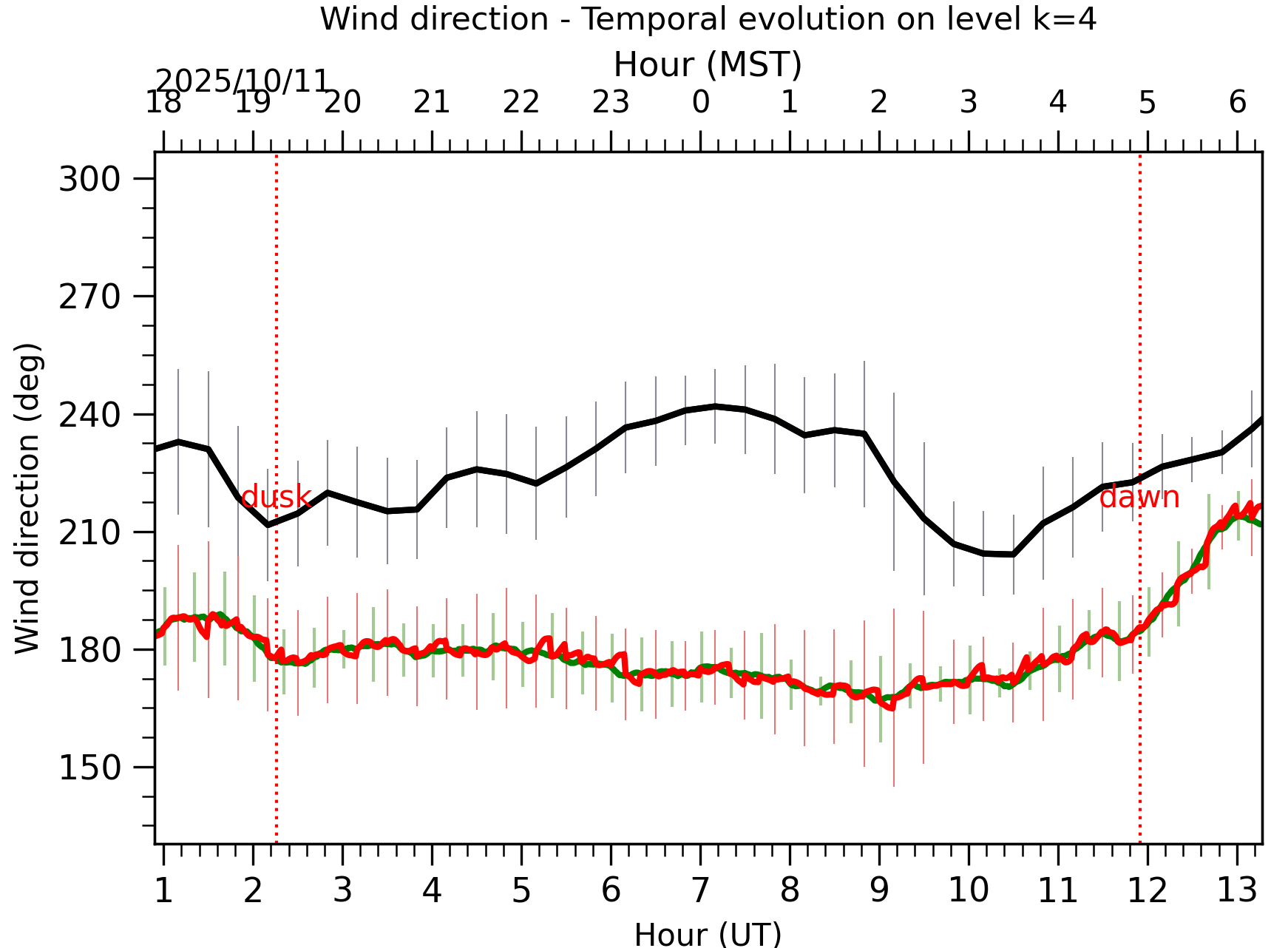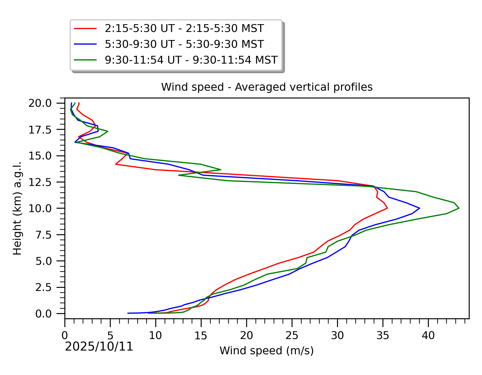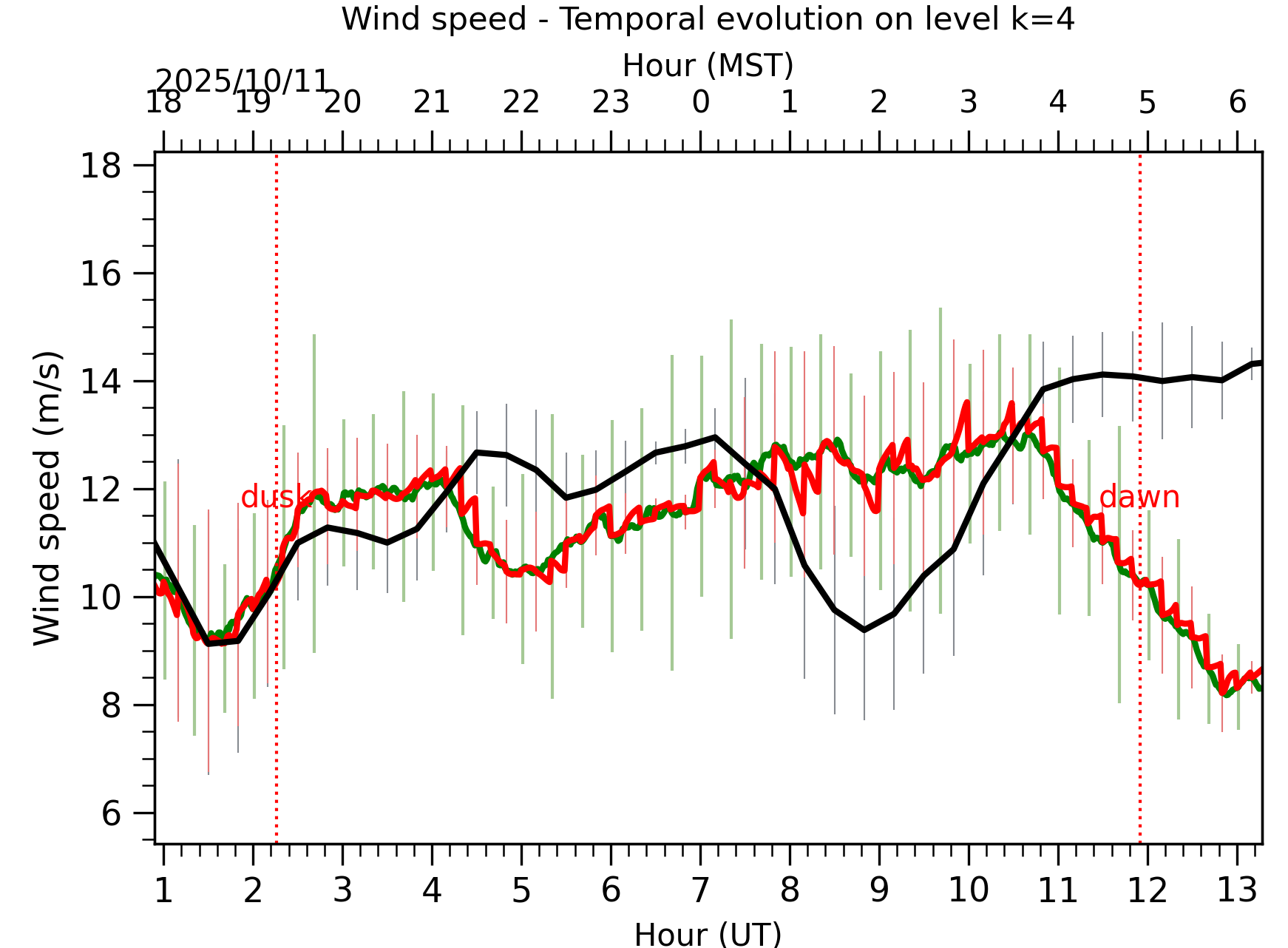 Fig. 8: Averaged wind speed in the three successive periods of the night (see red, blue and green intervals).