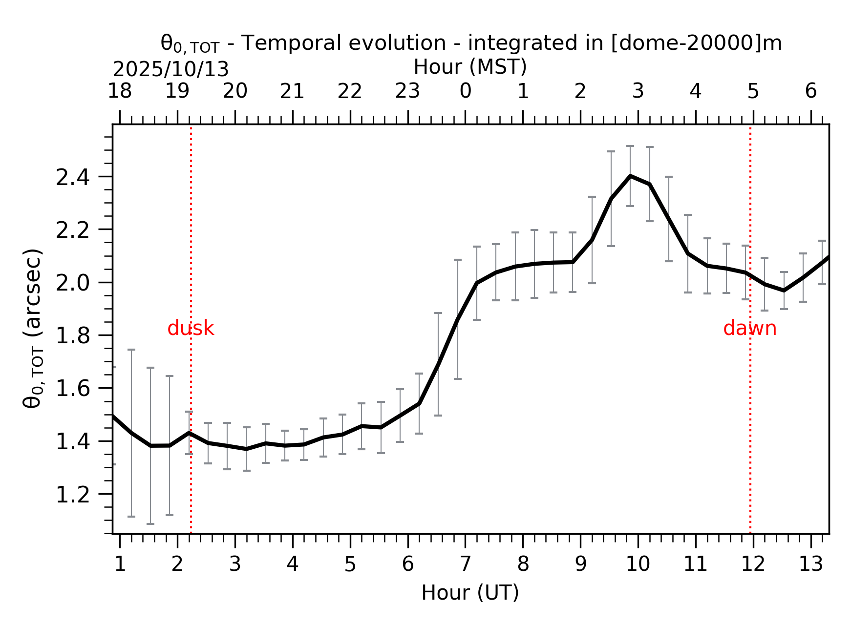 Fig. 2: Temporal evolution of θ0,TOT ([dome-20km]) between the sunset and the sunrise. |