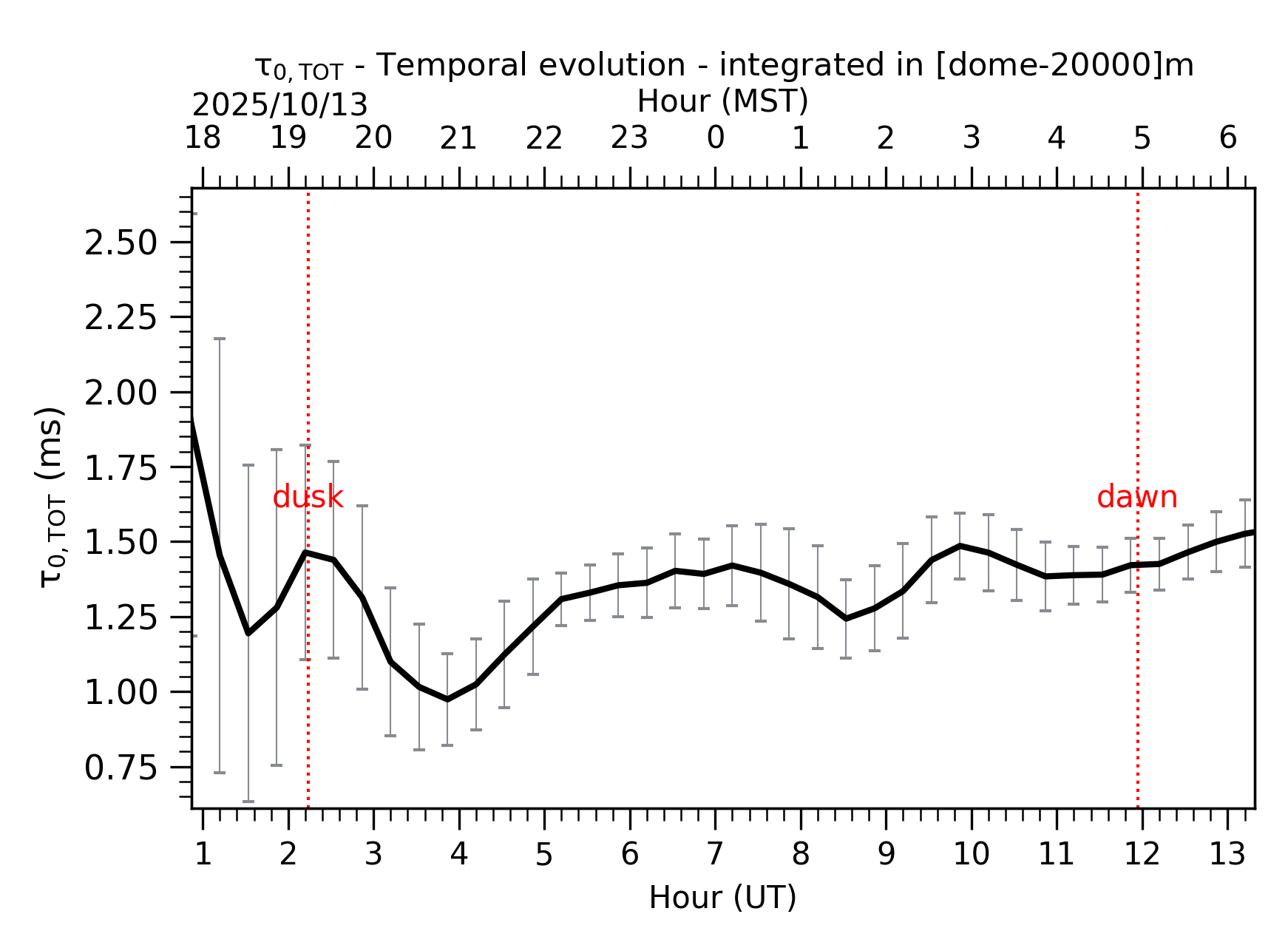 Fig. 3: Temporal evolution of τ0,TOT ([dome-20km]) between the sunset and the sunrise. |