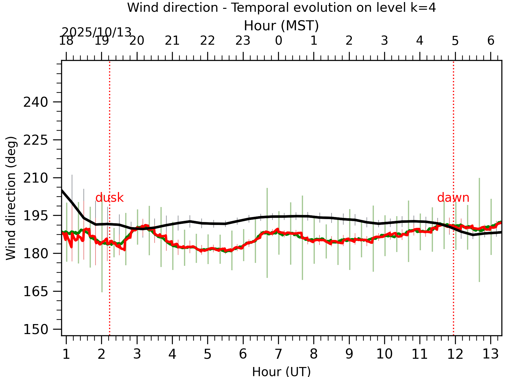 Fig. 6: Wind direction temporal evolution between the sunset and the sunrise at [38-62]m. |