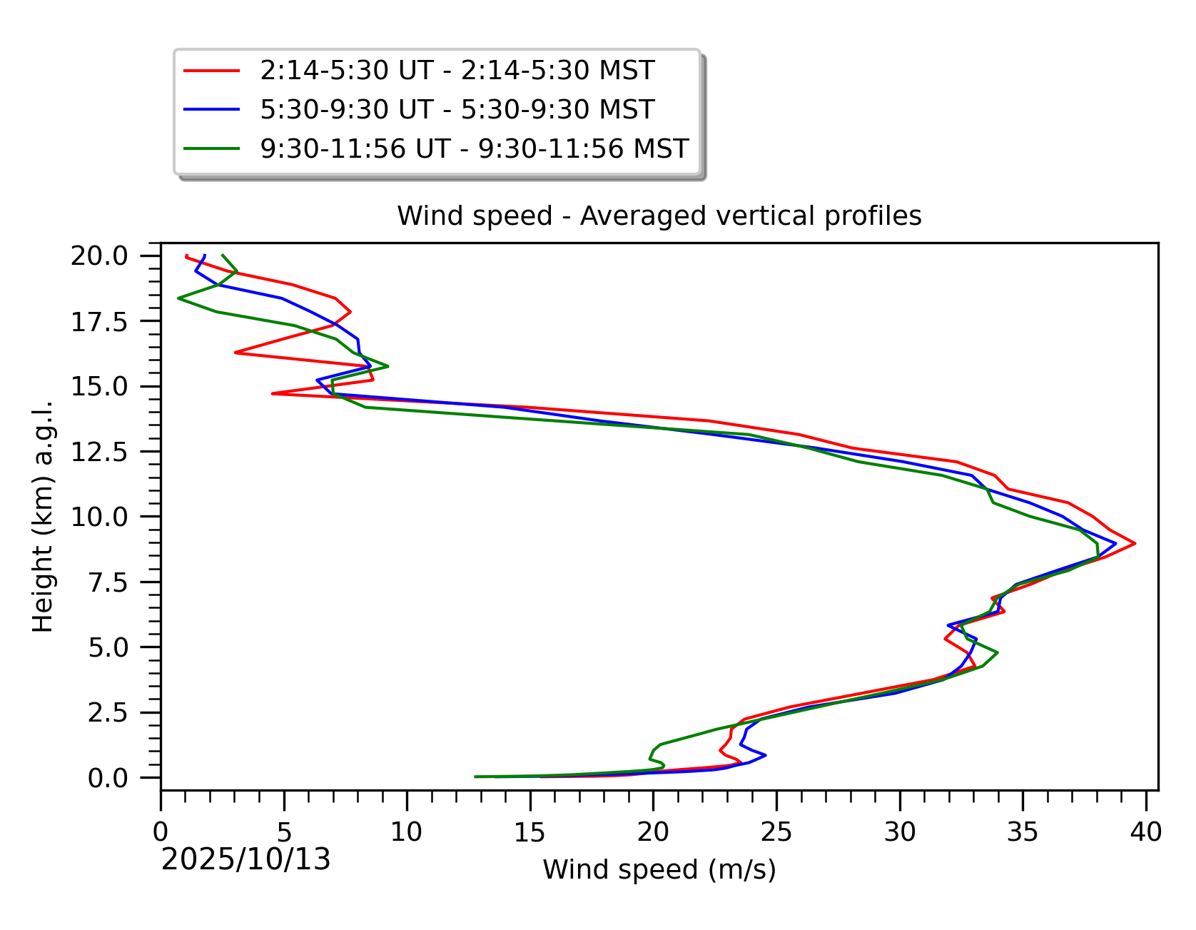 Fig. 8: Averaged wind speed in the three successive periods of the night (see red, blue and green intervals). |