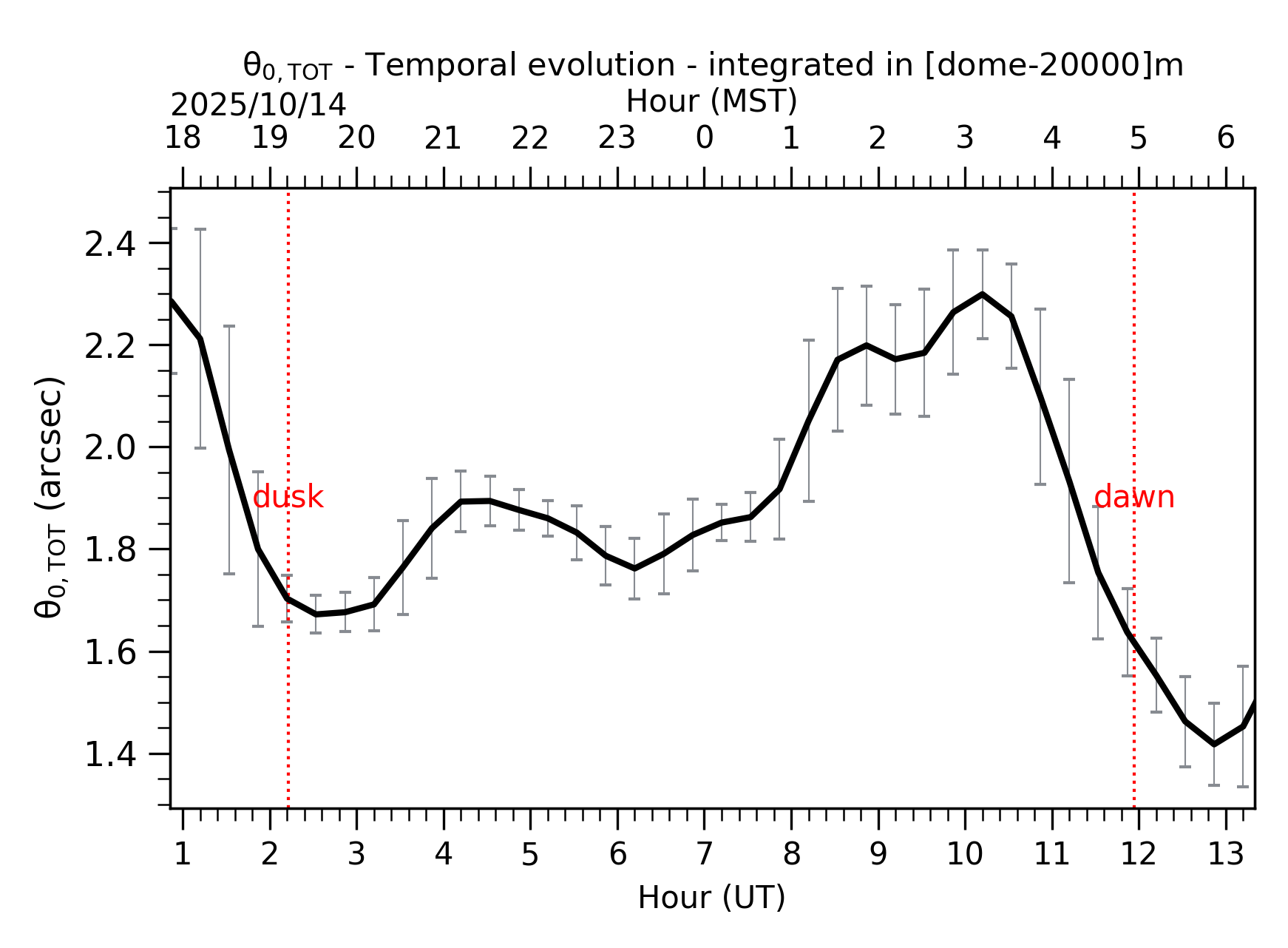 Fig. 2: Temporal evolution of θ0,TOT ([dome-20km]) between the sunset and the sunrise. |