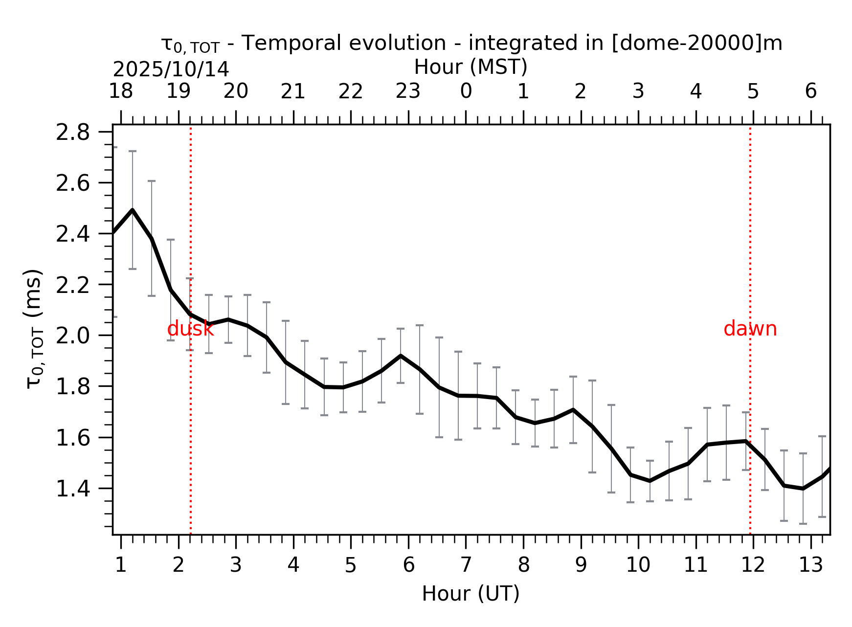 Fig. 3: Temporal evolution of τ0,TOT ([dome-20km]) between the sunset and the sunrise. |