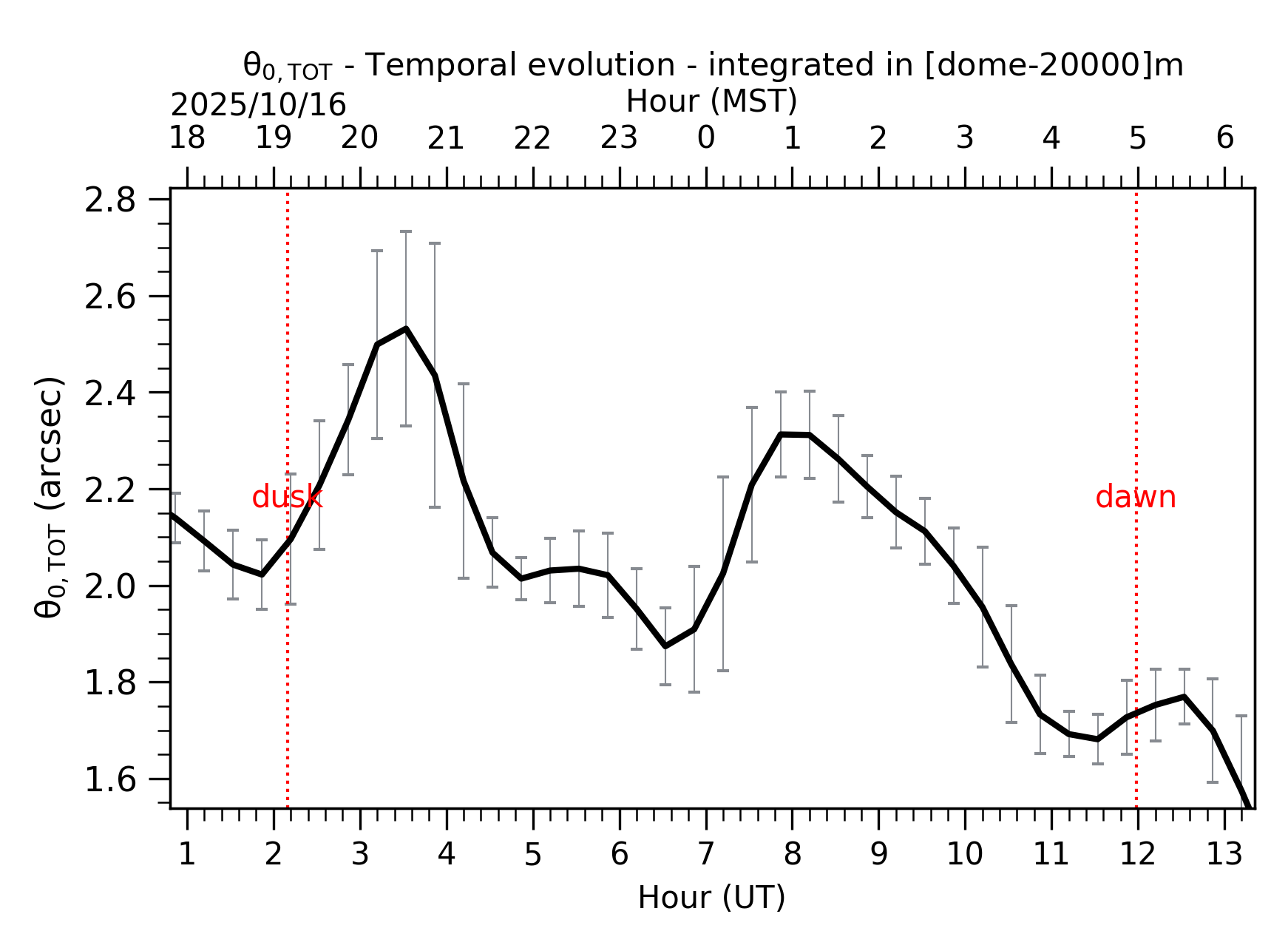 Fig. 2: Temporal evolution of θ0,TOT ([dome-20km]) between the sunset and the sunrise. |