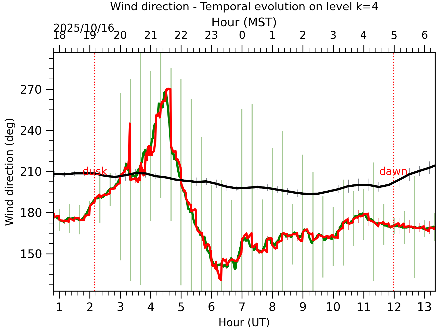 Fig. 6: Wind direction temporal evolution between the sunset and the sunrise at [38-62]m. |
