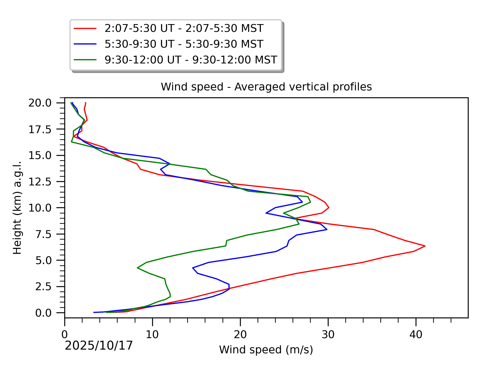 Fig. 8: Averaged wind speed in the three successive periods of the night (see red, blue and green intervals). |