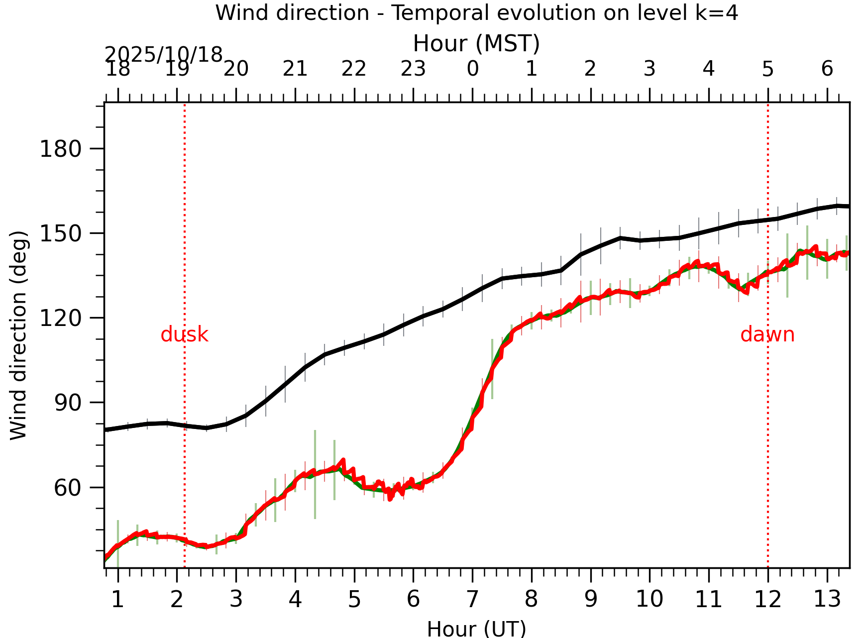 Fig. 6: Wind direction temporal evolution between the sunset and the sunrise at [38-62]m. |