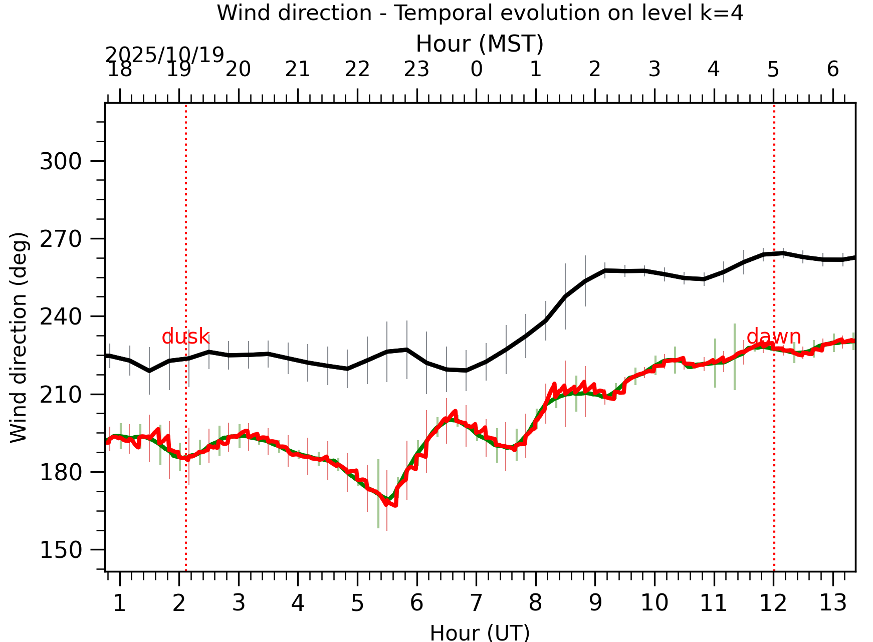 Fig. 8: Averaged wind speed in the three successive periods of the night (see red, blue and green intervals).