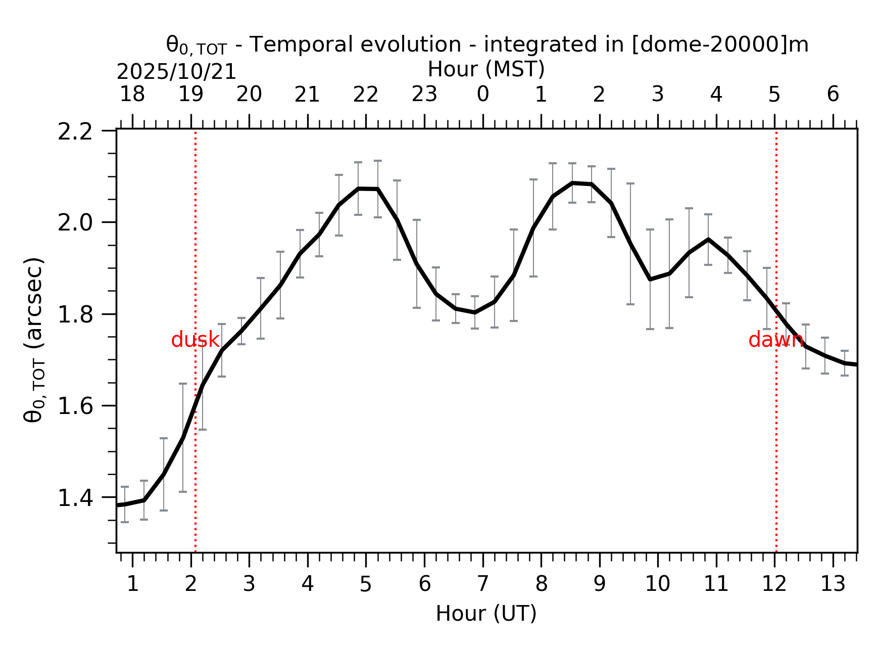 Fig. 2: Temporal evolution of θ0,TOT ([dome-20km]) between the sunset and the sunrise. |