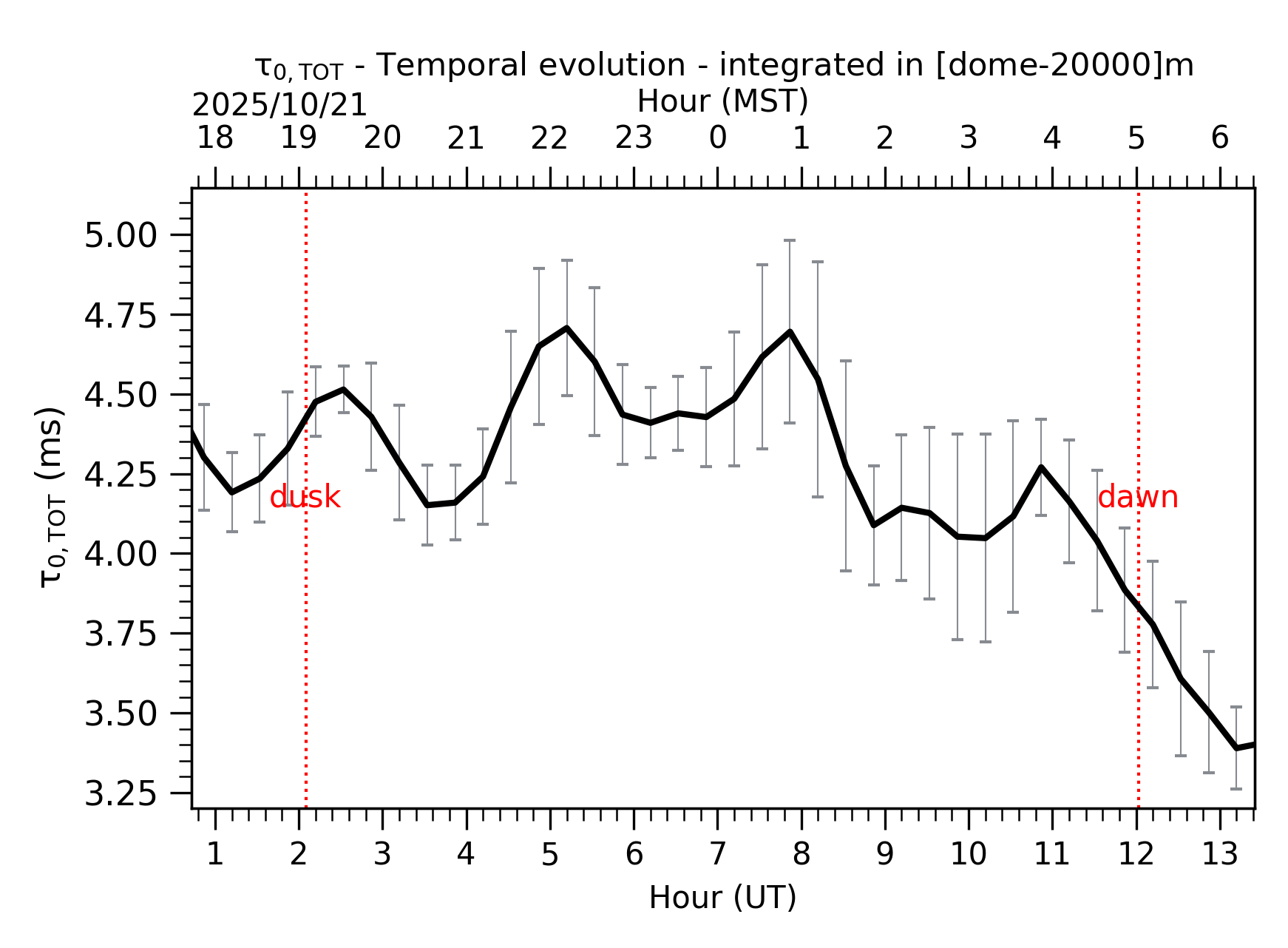 Fig. 3: Temporal evolution of τ0,TOT ([dome-20km]) between the sunset and the sunrise. |