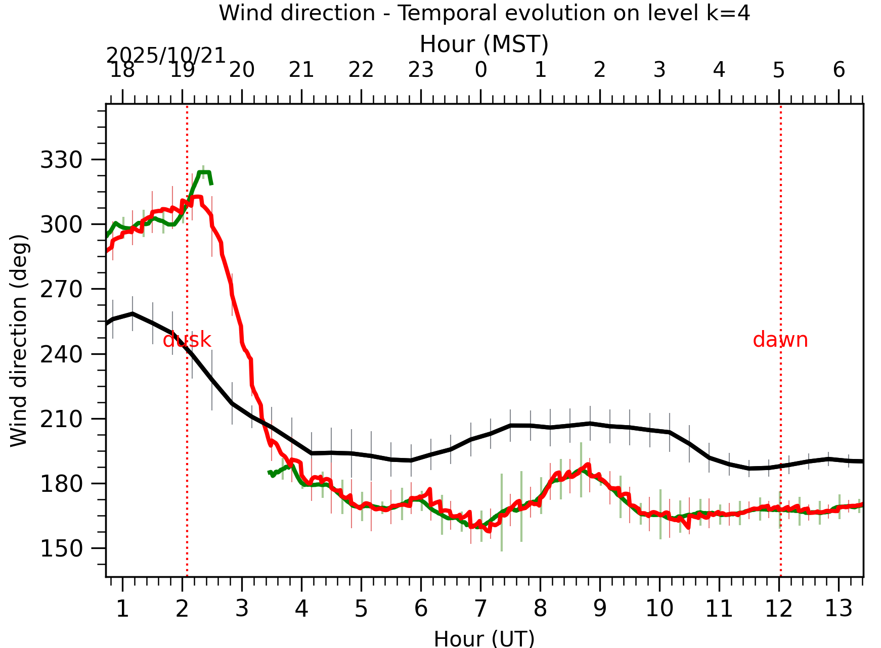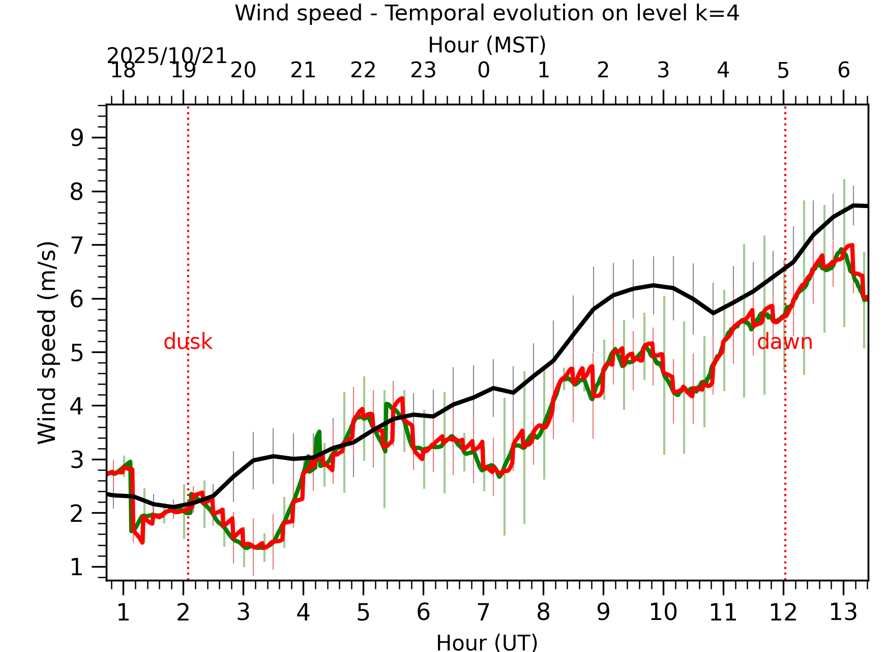 Fig. 8: Averaged wind speed in the three successive periods of the night (see red, blue and green intervals). |