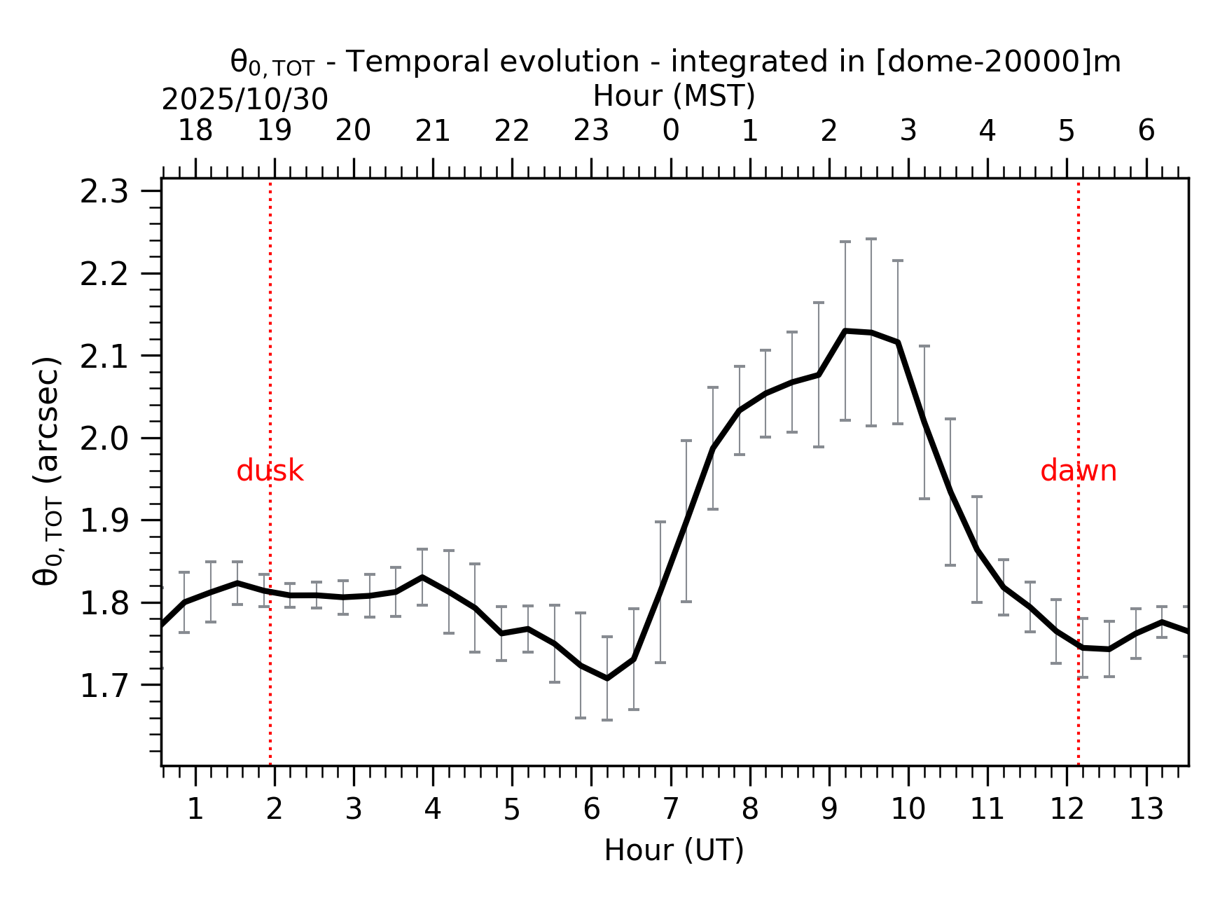 Fig. 2: Temporal evolution of θ0,TOT ([dome-20km]) between the sunset and the sunrise.