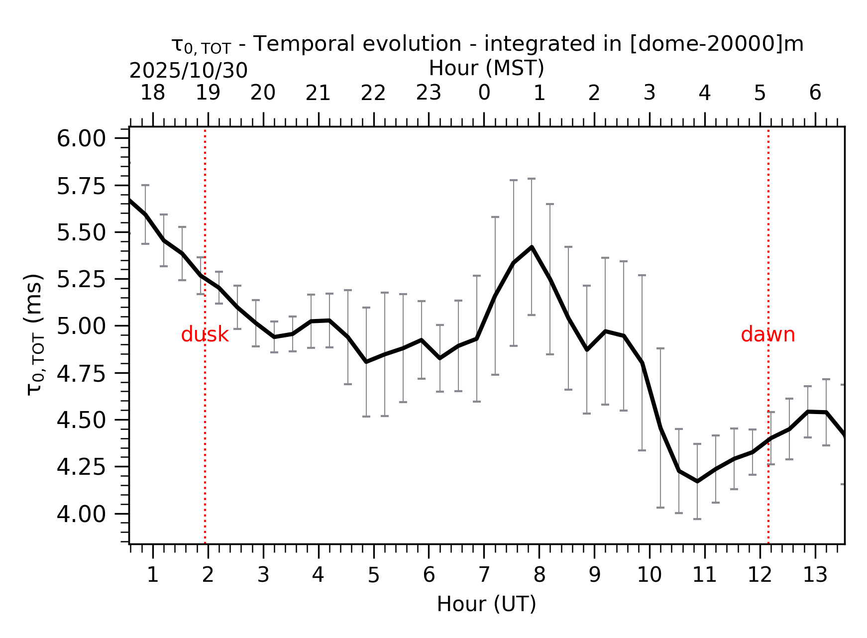 Fig. 3: Temporal evolution of τ0,TOT ([dome-20km]) between the sunset and the sunrise.
