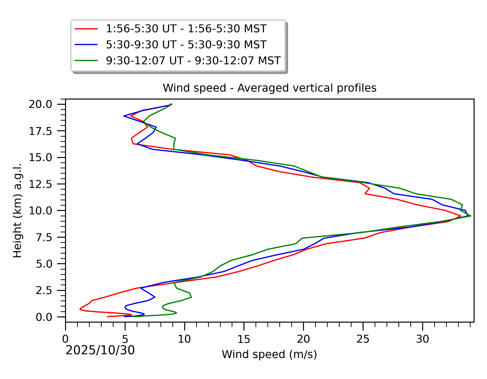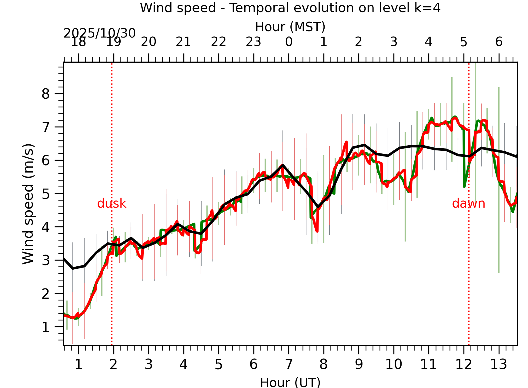 Fig. 8: Averaged wind speed in the three successive periods of the night (see red, blue and green intervals).