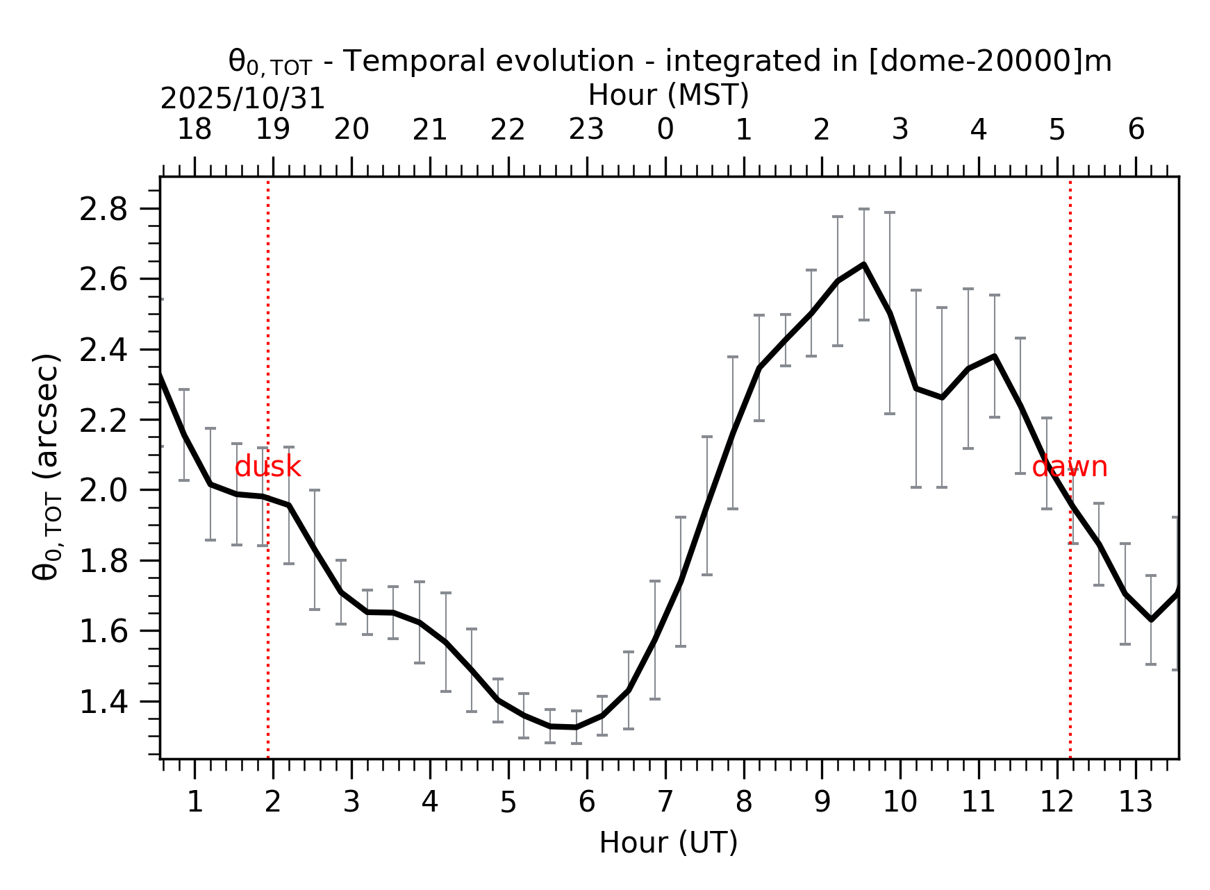 Fig. 2: Temporal evolution of θ0,TOT ([dome-20km]) between the sunset and the sunrise. |