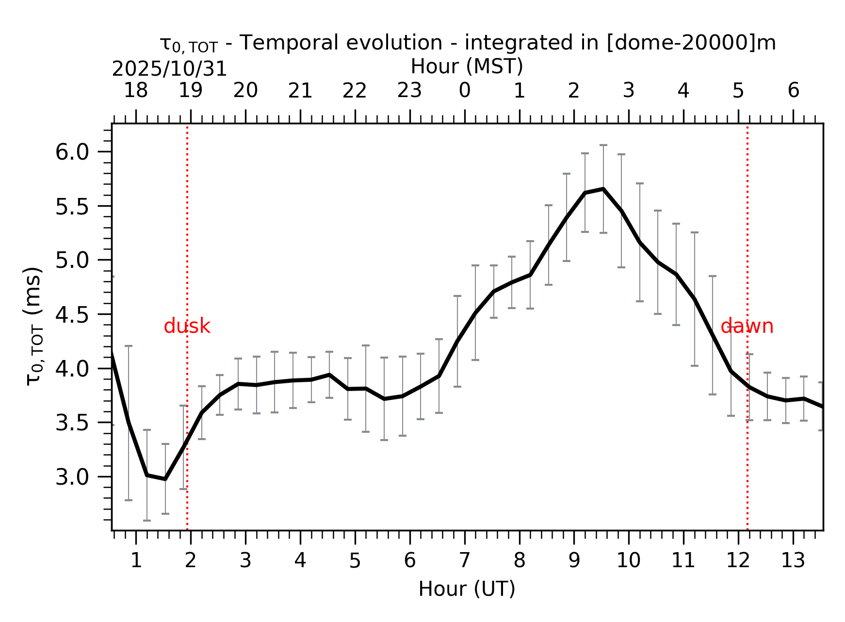 Fig. 3: Temporal evolution of τ0,TOT ([dome-20km]) between the sunset and the sunrise. |