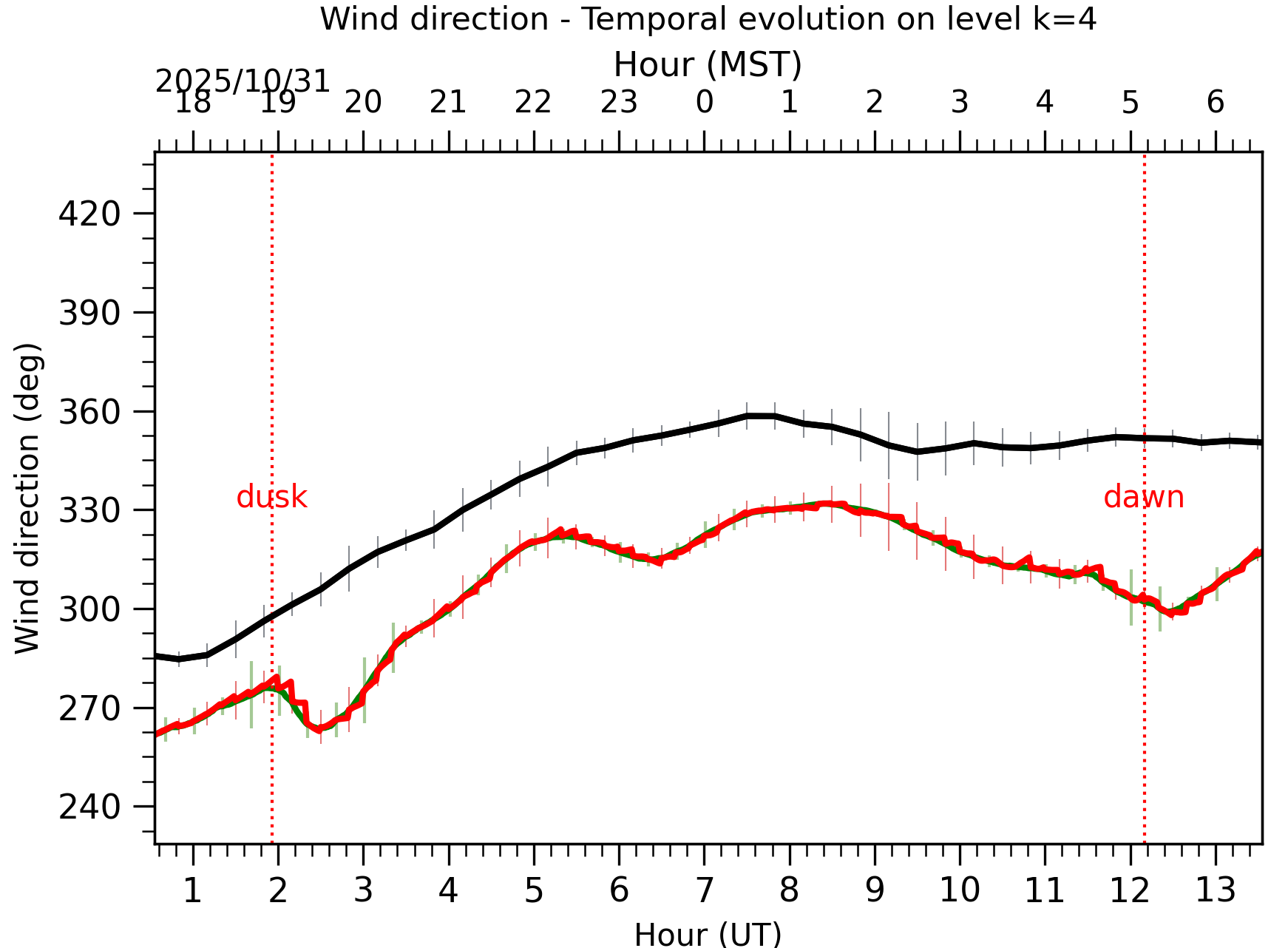 Fig. 6: Wind direction temporal evolution between the sunset and the sunrise at [38-62]m. |