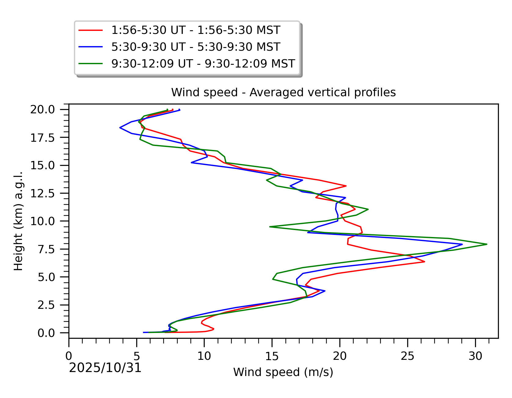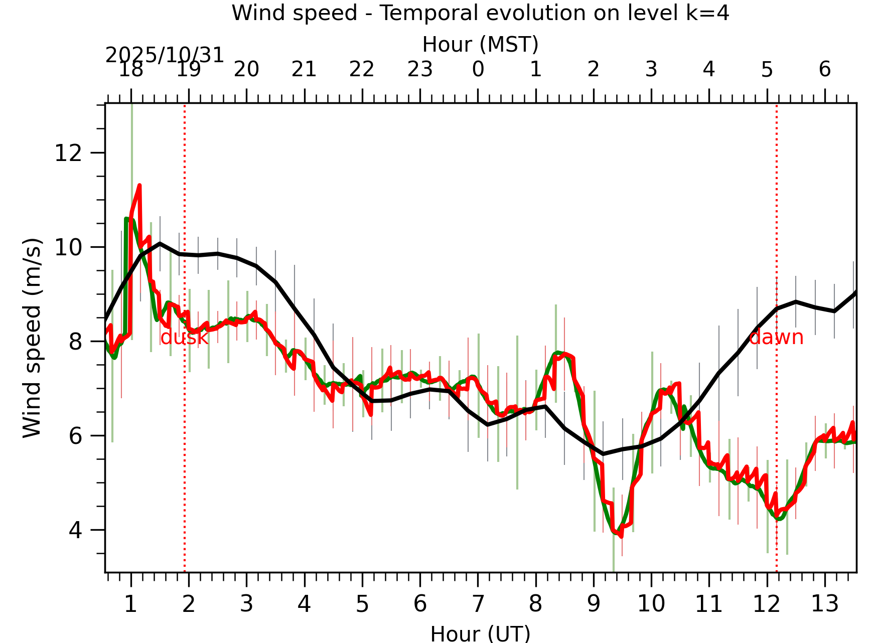 Fig. 8: Averaged wind speed in the three successive periods of the night (see red, blue and green intervals). |