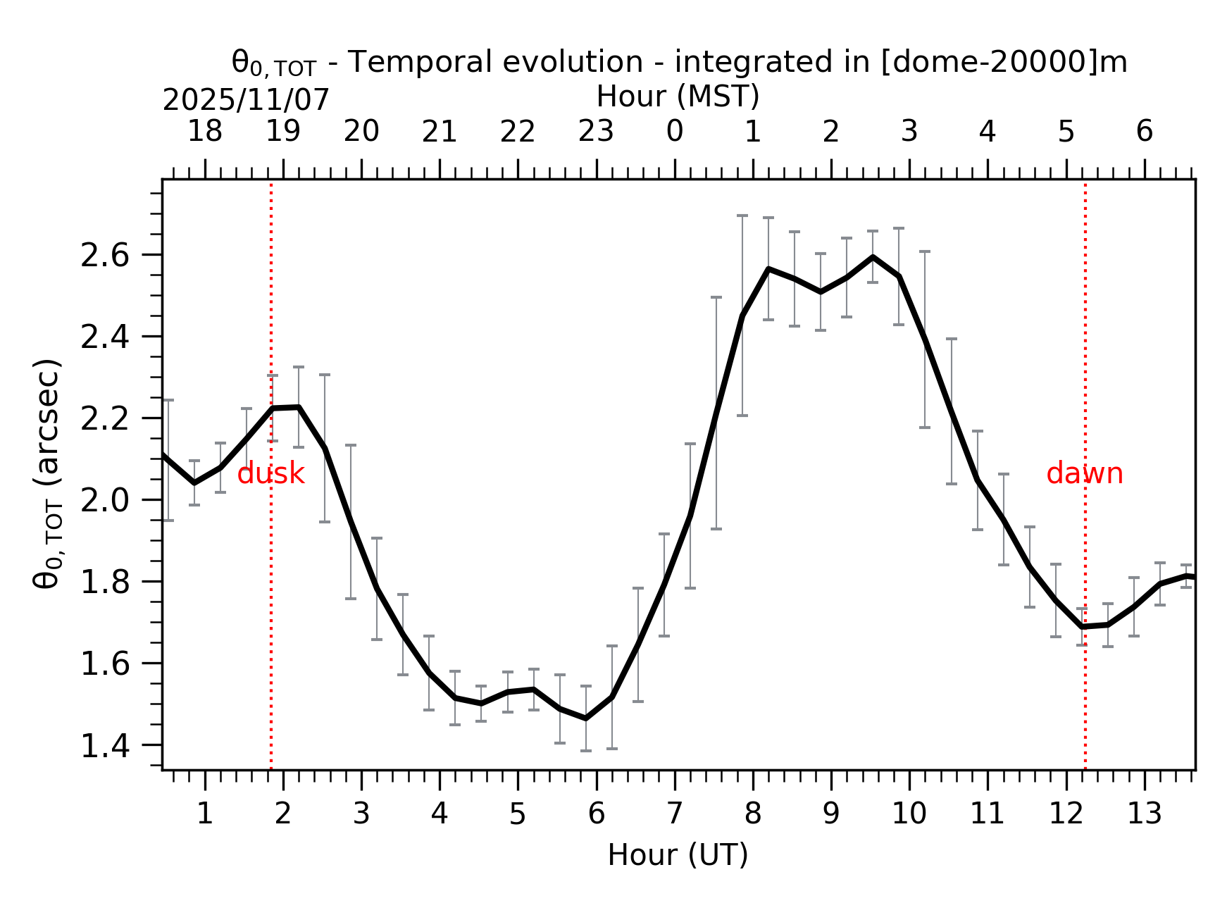 Fig. 2: Temporal evolution of θ0,TOT ([dome-20km]) between the sunset and the sunrise. |