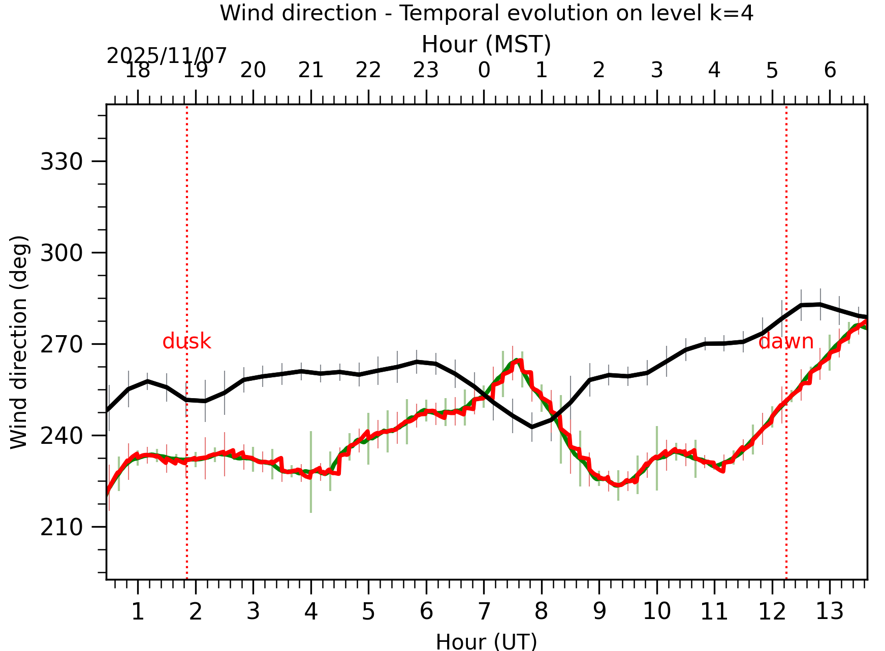 Fig. 6: Wind direction temporal evolution between the sunset and the sunrise at [38-62]m. |