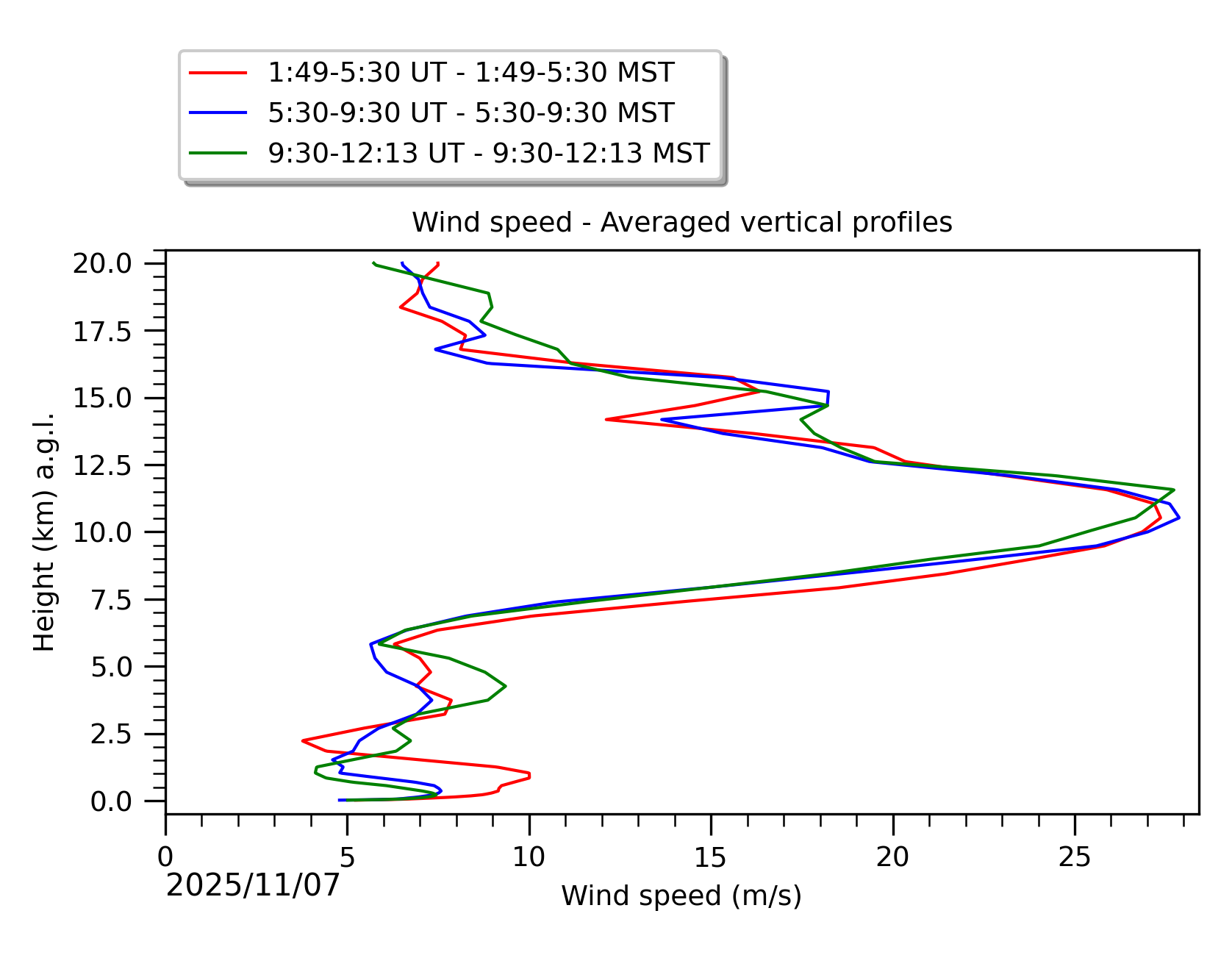 Fig. 8: Averaged wind speed in the three successive periods of the night (see red, blue and green intervals). |