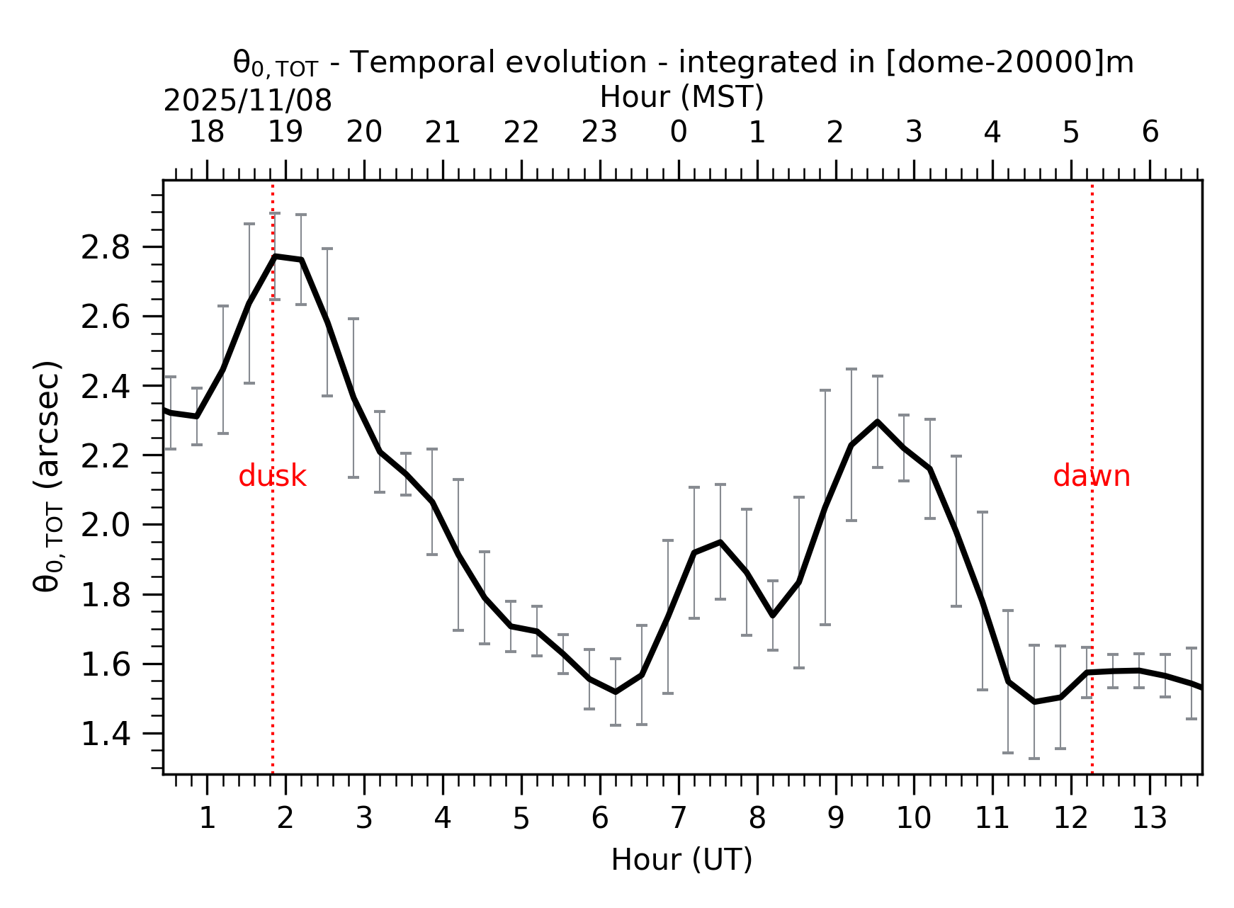 Fig. 2: Temporal evolution of θ0,TOT ([dome-20km]) between the sunset and the sunrise.