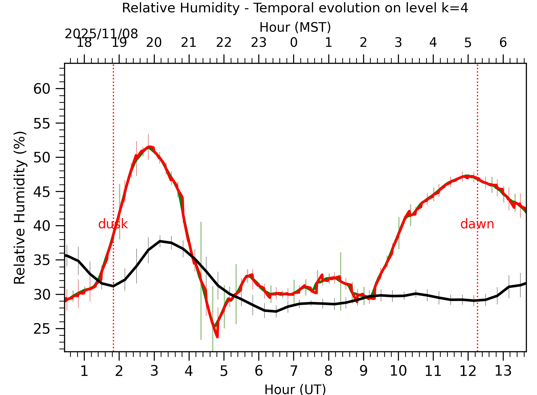 Fig. 8: Relative humidity temporal evolution between the sunset and the sunrise at [38-62]m.