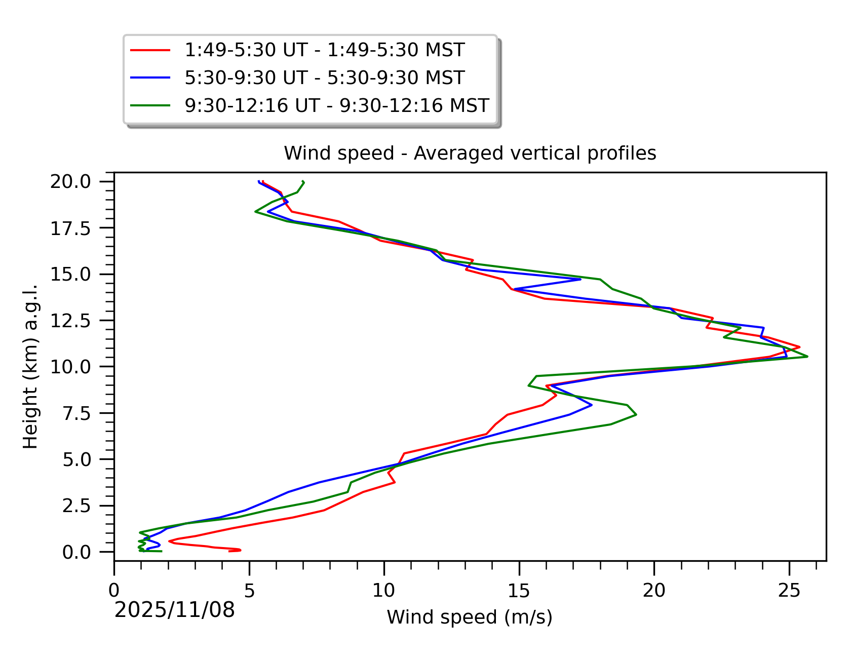 Fig. 8: Averaged wind speed in the three successive periods of the night (see red, blue and green intervals).