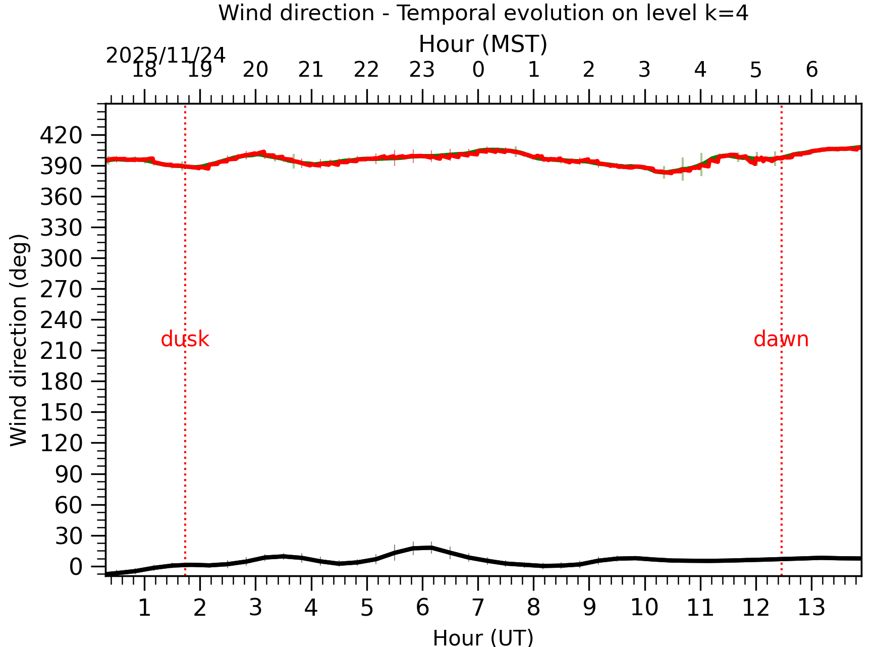 Fig. 6: Wind direction temporal evolution between the sunset and the sunrise at [38-62]m. |