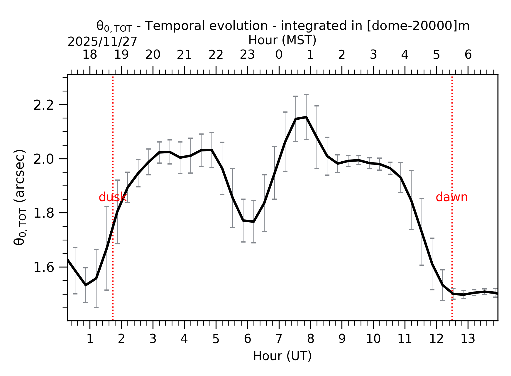 Fig. 2: Temporal evolution of θ0,TOT ([dome-20km]) between the sunset and the sunrise.