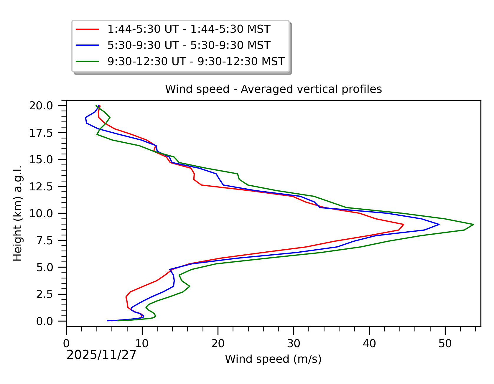 Fig. 8: Averaged wind speed in the three successive periods of the night (see red, blue and green intervals).