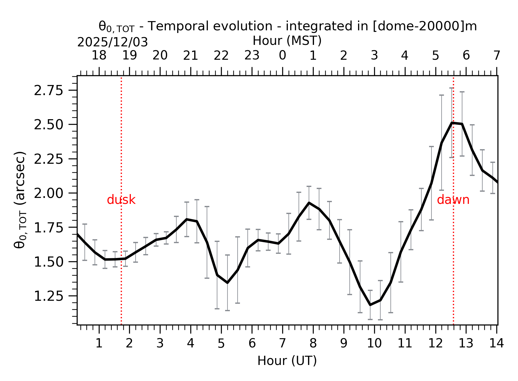 Fig. 2: Temporal evolution of θ0,TOT ([dome-20km]) between the sunset and the sunrise. |
