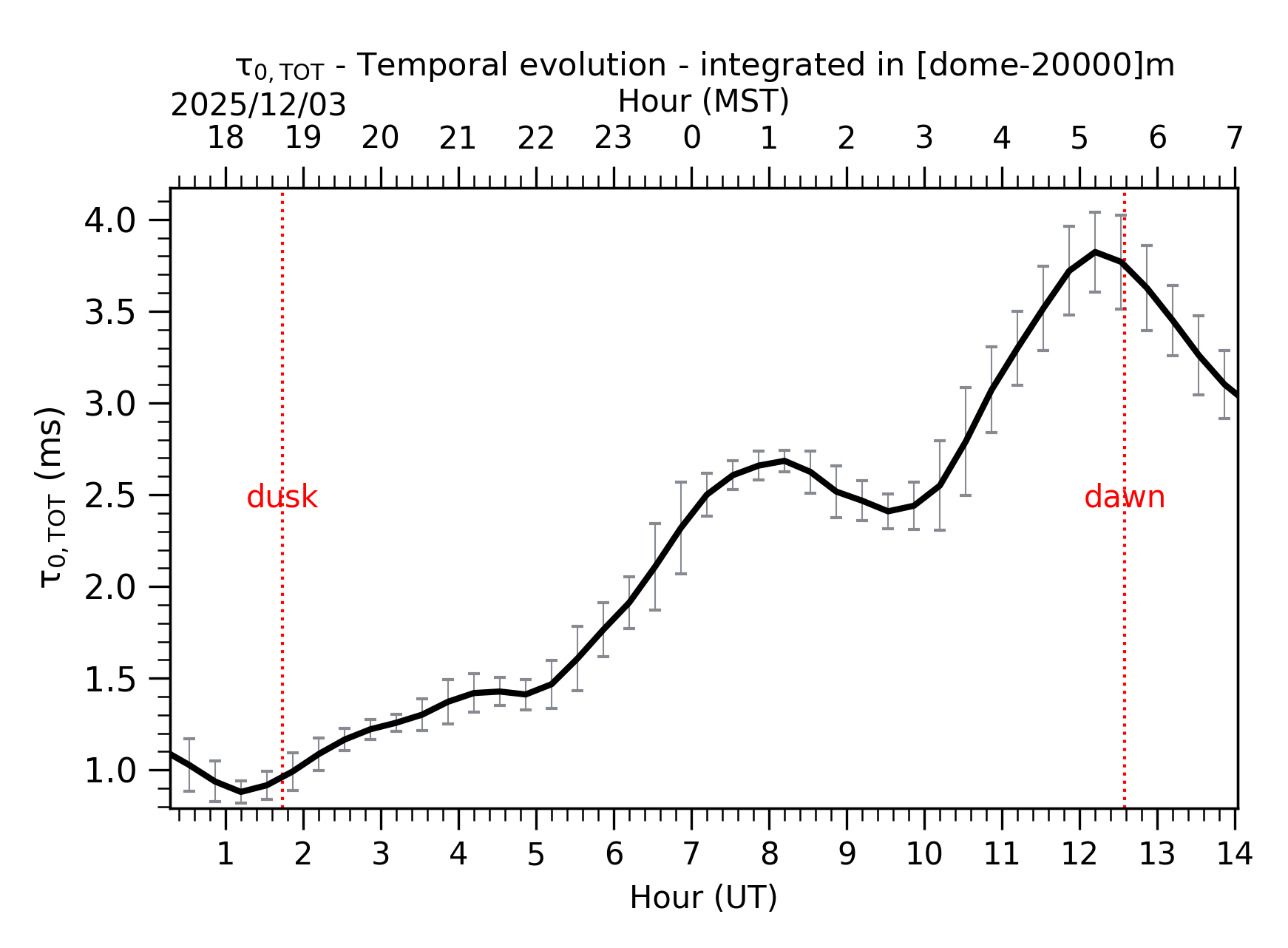 Fig. 3: Temporal evolution of τ0,TOT ([dome-20km]) between the sunset and the sunrise. |