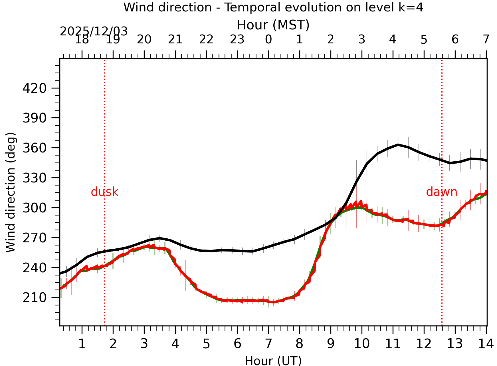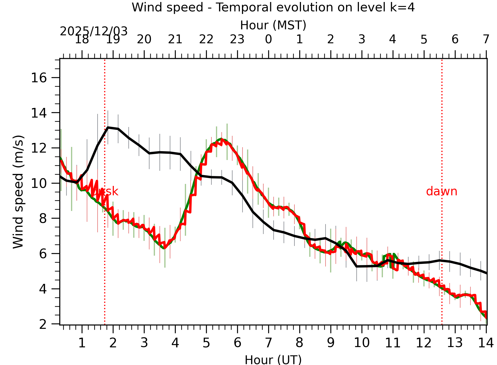 Fig. 8: Averaged wind speed in the three successive periods of the night (see red, blue and green intervals). |