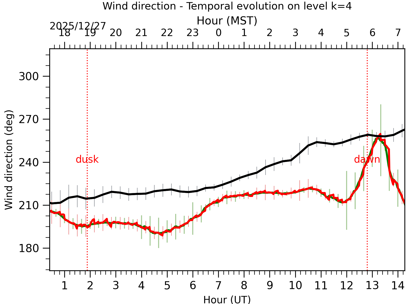 Fig. 6: Wind direction temporal evolution between the sunset and the sunrise at [38-62]m. |