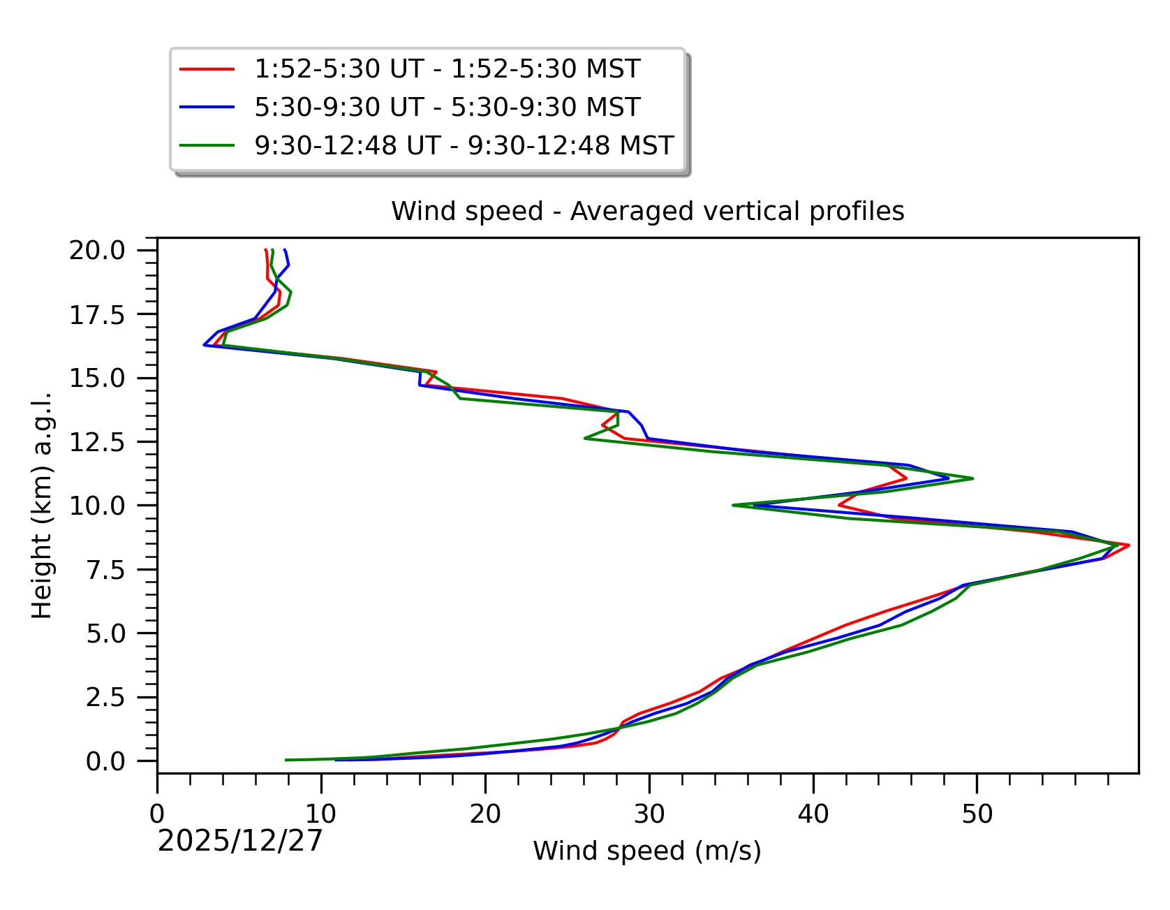 Fig. 8: Averaged wind speed in the three successive periods of the night (see red, blue and green intervals). |