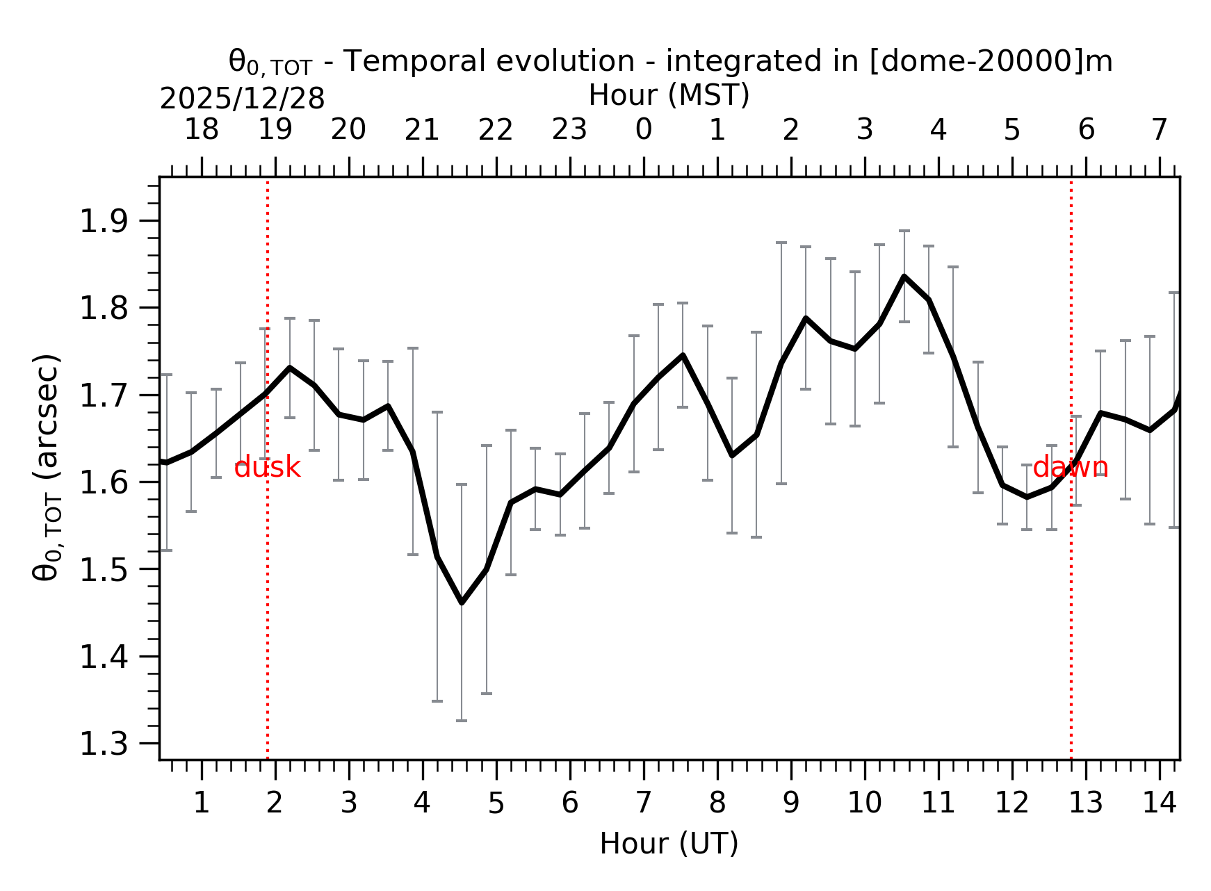 Fig. 2: Temporal evolution of θ0,TOT ([dome-20km]) between the sunset and the sunrise. |