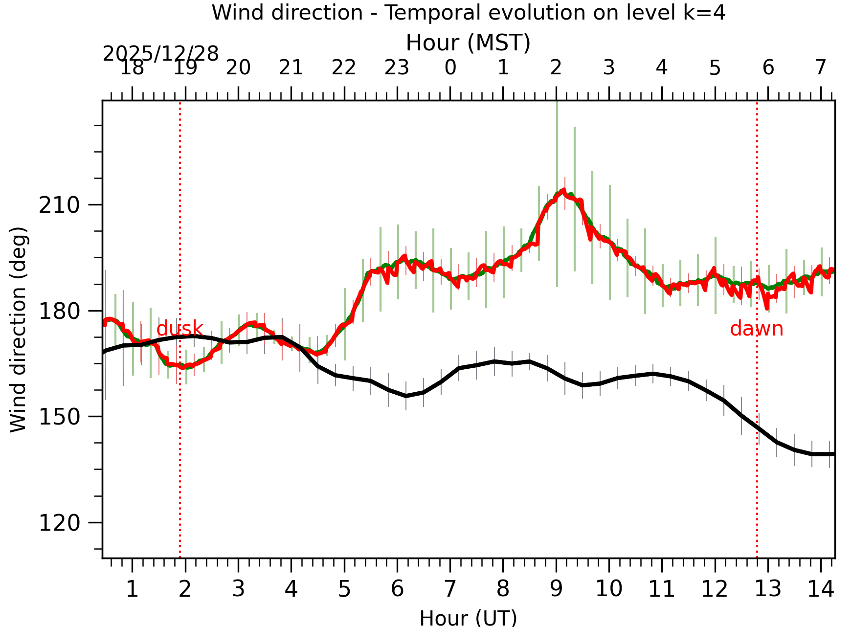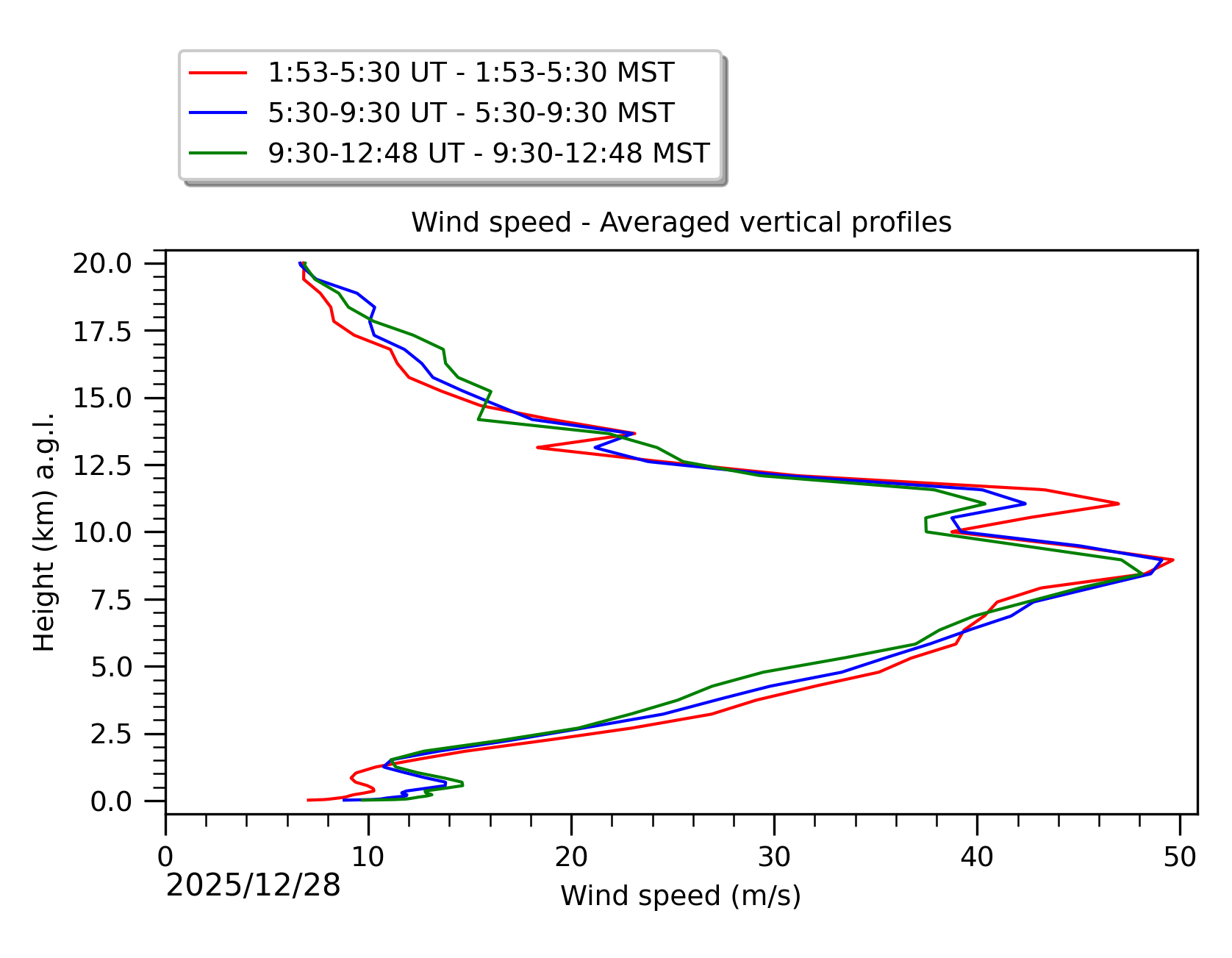 Fig. 8: Averaged wind speed in the three successive periods of the night (see red, blue and green intervals). |