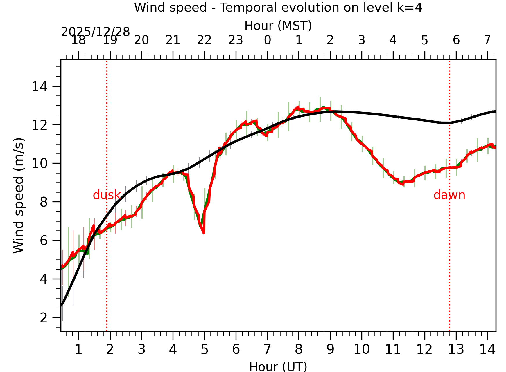 Fig. 5: Wind speed temporal evolution between the sunset and the sunrise at [38-62]m. |