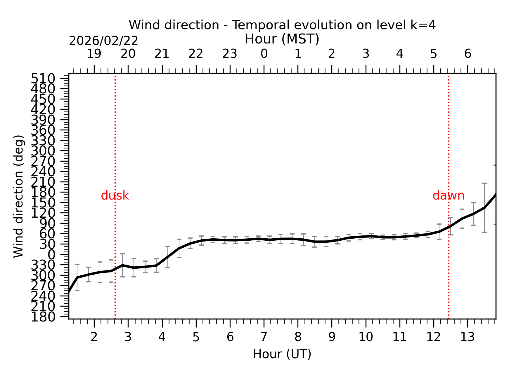 Fig. 6: Wind direction temporal evolution between the sunset and the sunrise at [38-62]m. |