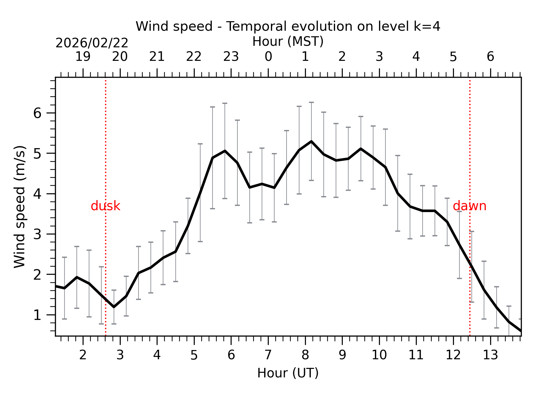 Fig. 5: Wind speed temporal evolution between the sunset and the sunrise at [38-62]m. |