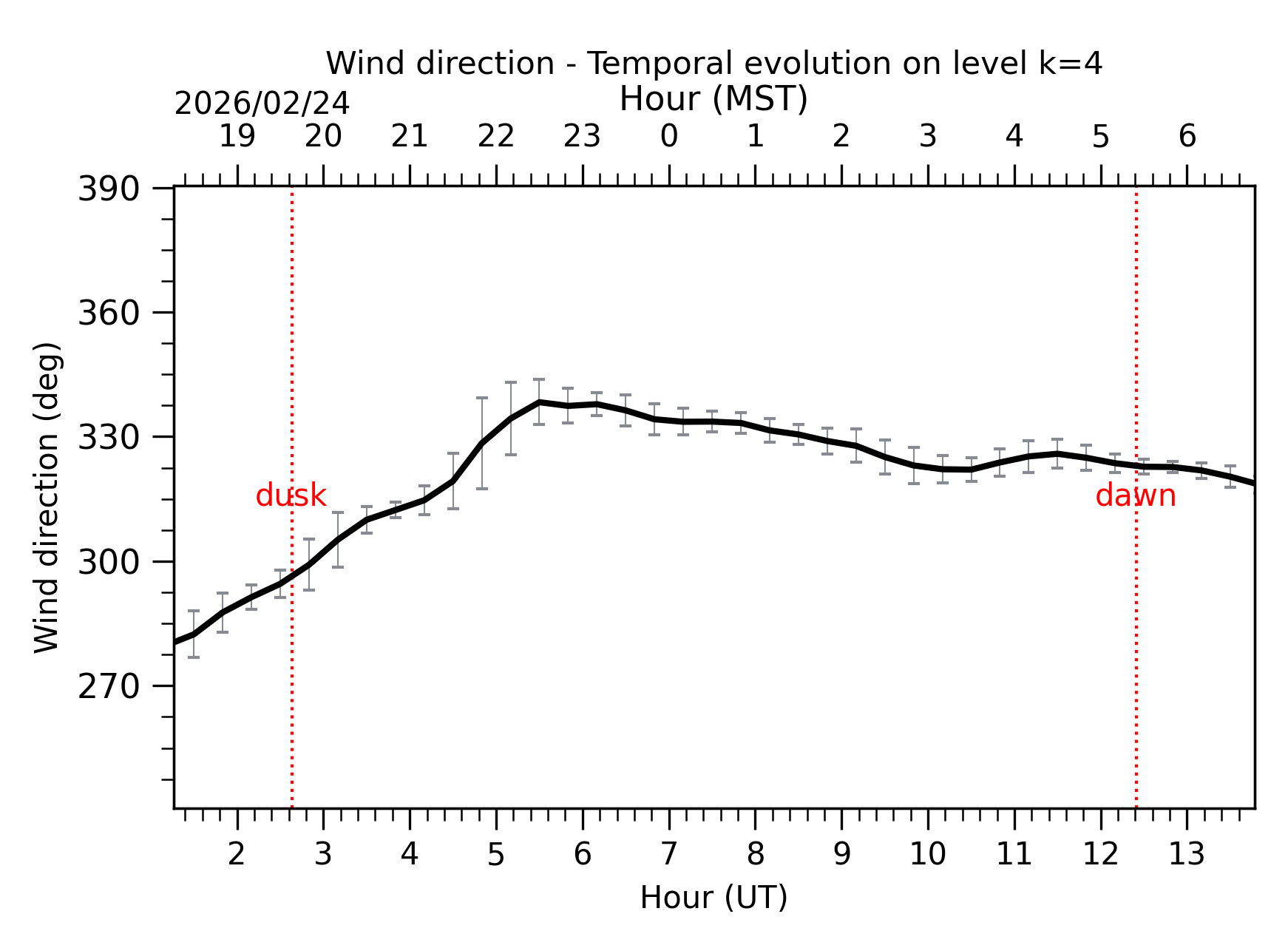 Fig. 6: Wind direction temporal evolution between the sunset and the sunrise at [38-62]m.