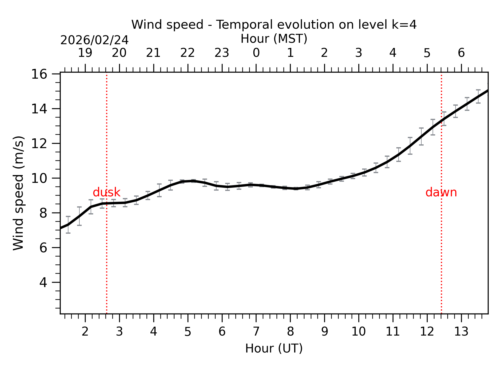 Fig. 5: Wind speed temporal evolution between the sunset and the sunrise at [38-62]m.