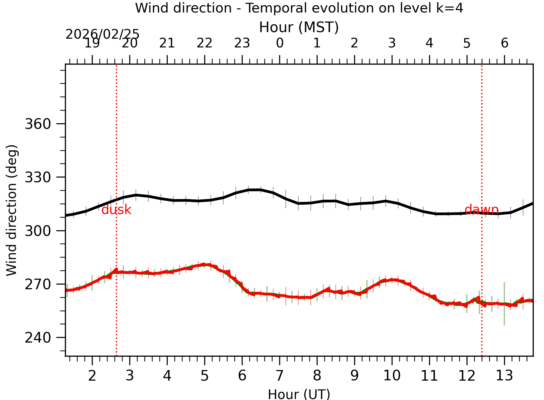 Fig. 6: Wind direction temporal evolution between the sunset and the sunrise at [38-62]m. |